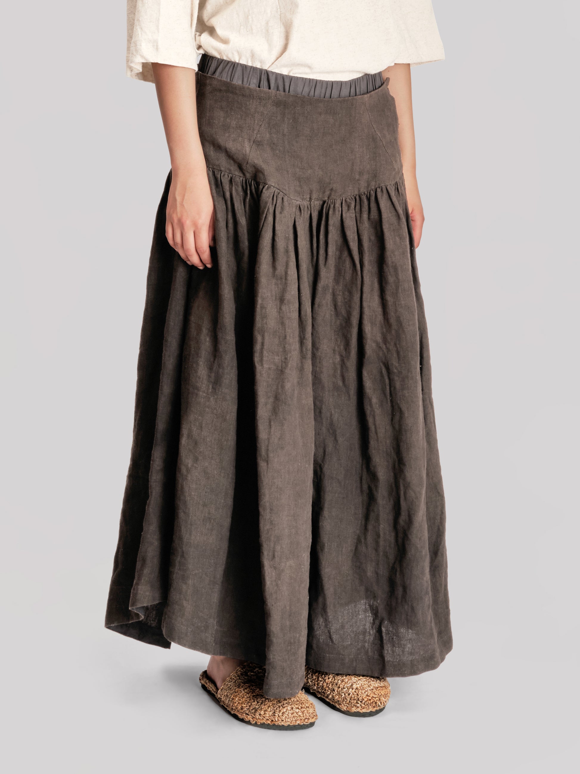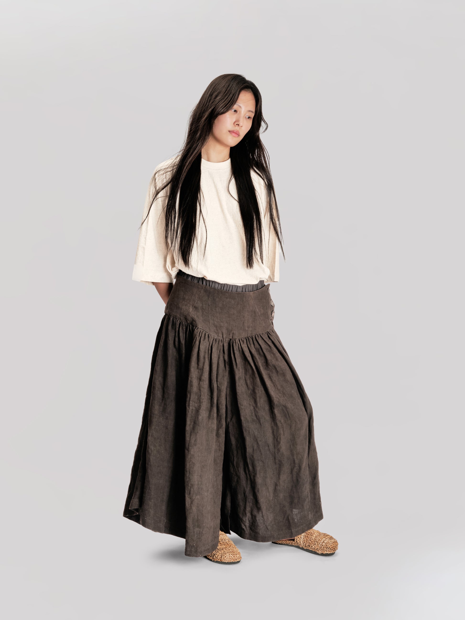GARMENT – Widely cut trousers with deeply pleated legs that create generous, skirt-like volume and ease of movement. A double waistband sits firmly at the waist, finished with ceramic buttons, while a delicate ankle slit adds a refined detail to the sweeping silhouette.