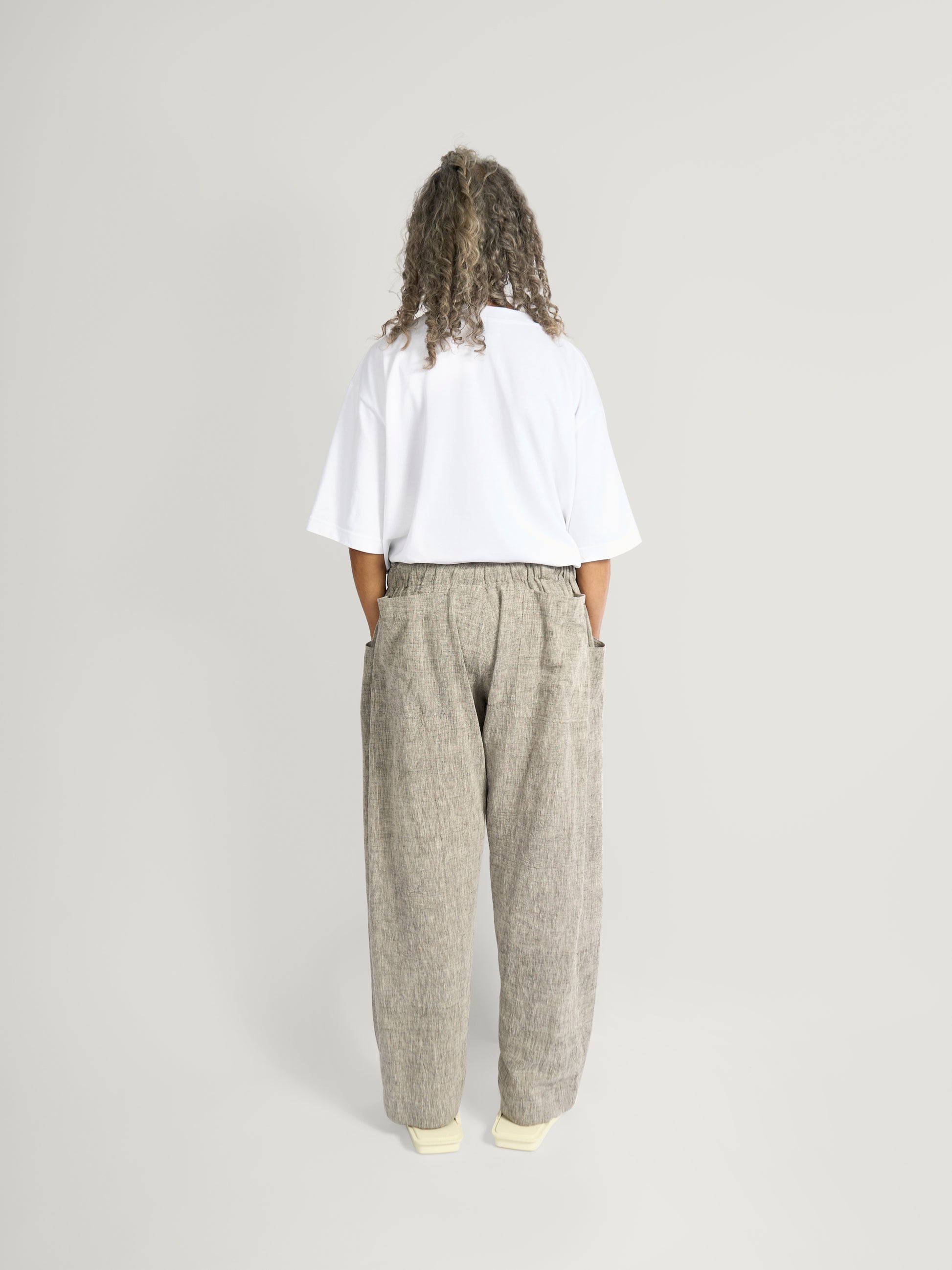 GARMENT – Relaxed straight-leg pant cut in a baggy silhouette, designed for effortless movement and ease. A single pleat adds subtle volume, while deep curved pockets enhance both function and shape. Finished with an elastic waistband for comfort, the design balances utility with understated elegance — a versatile pant that carries both structure and softness.