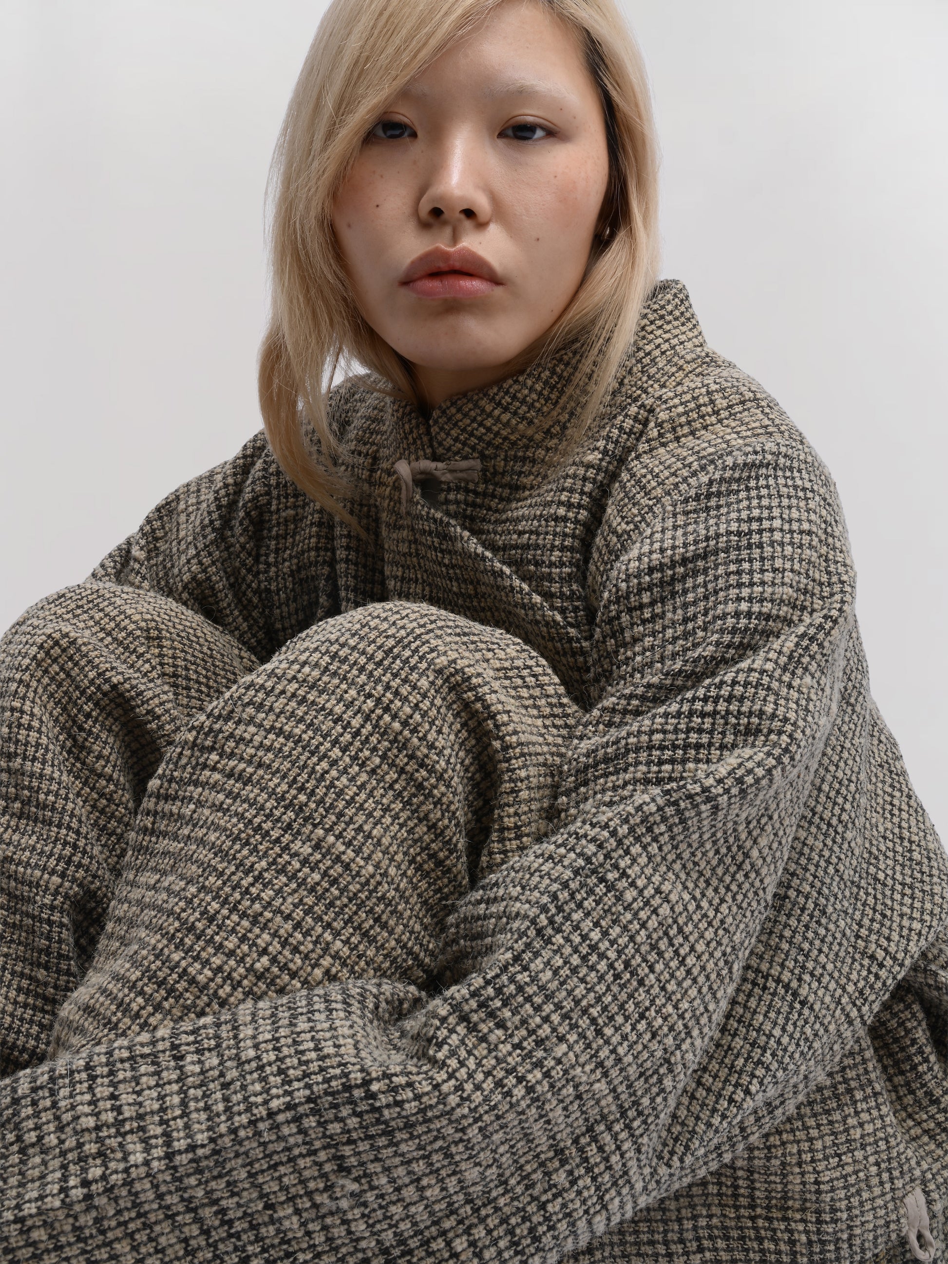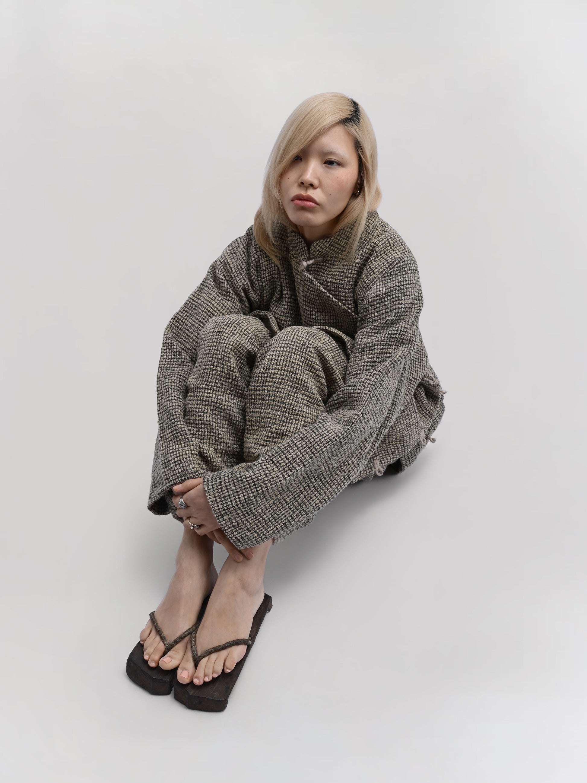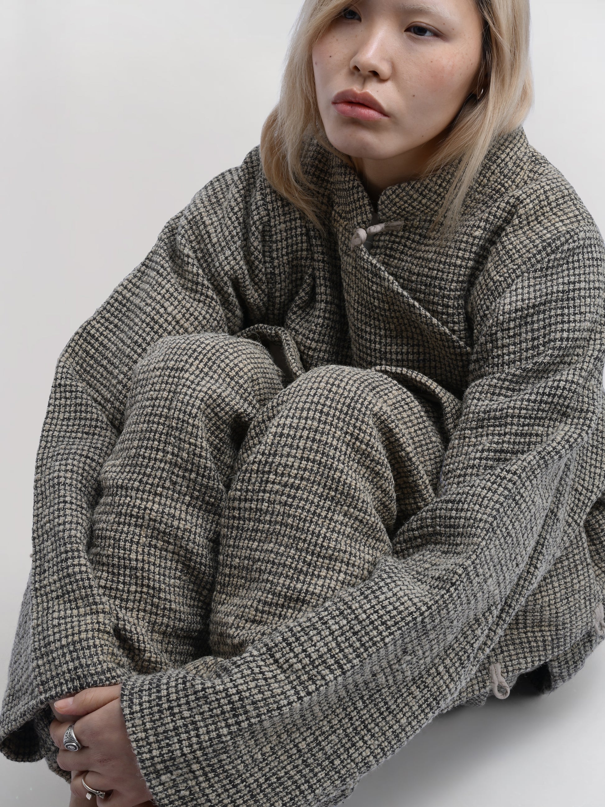 MATERIALS – Handwoven raw wool tweed, naturally dyed in Taupe Brown tone. The textured weave offers durability and a distinctive artisanal character. Finished with natural shell buttons for a subtle, organic touch.