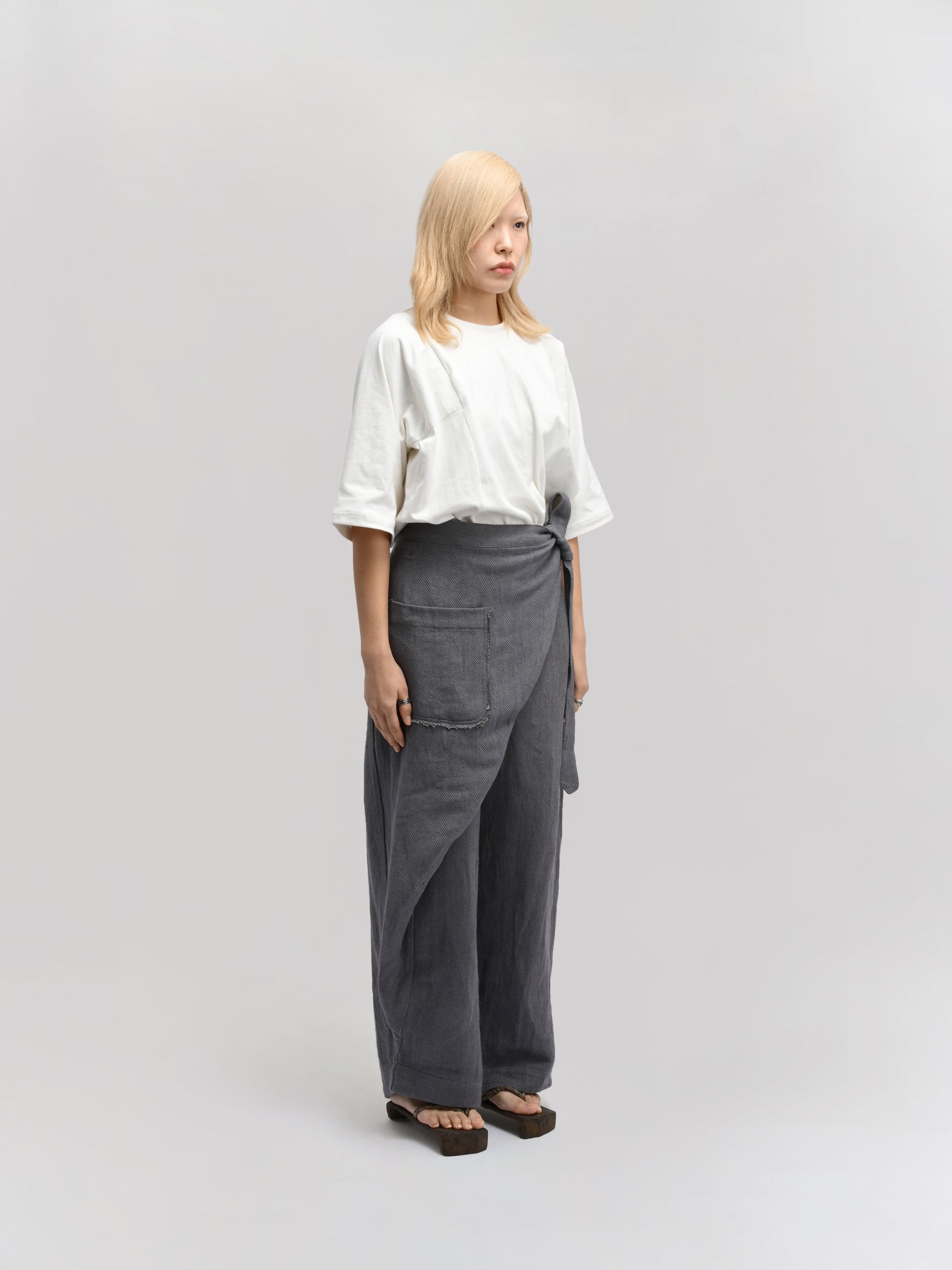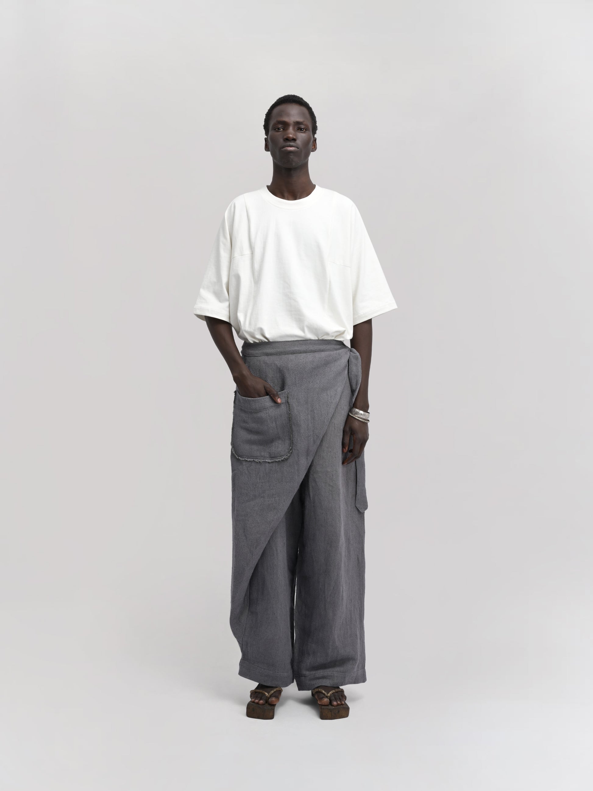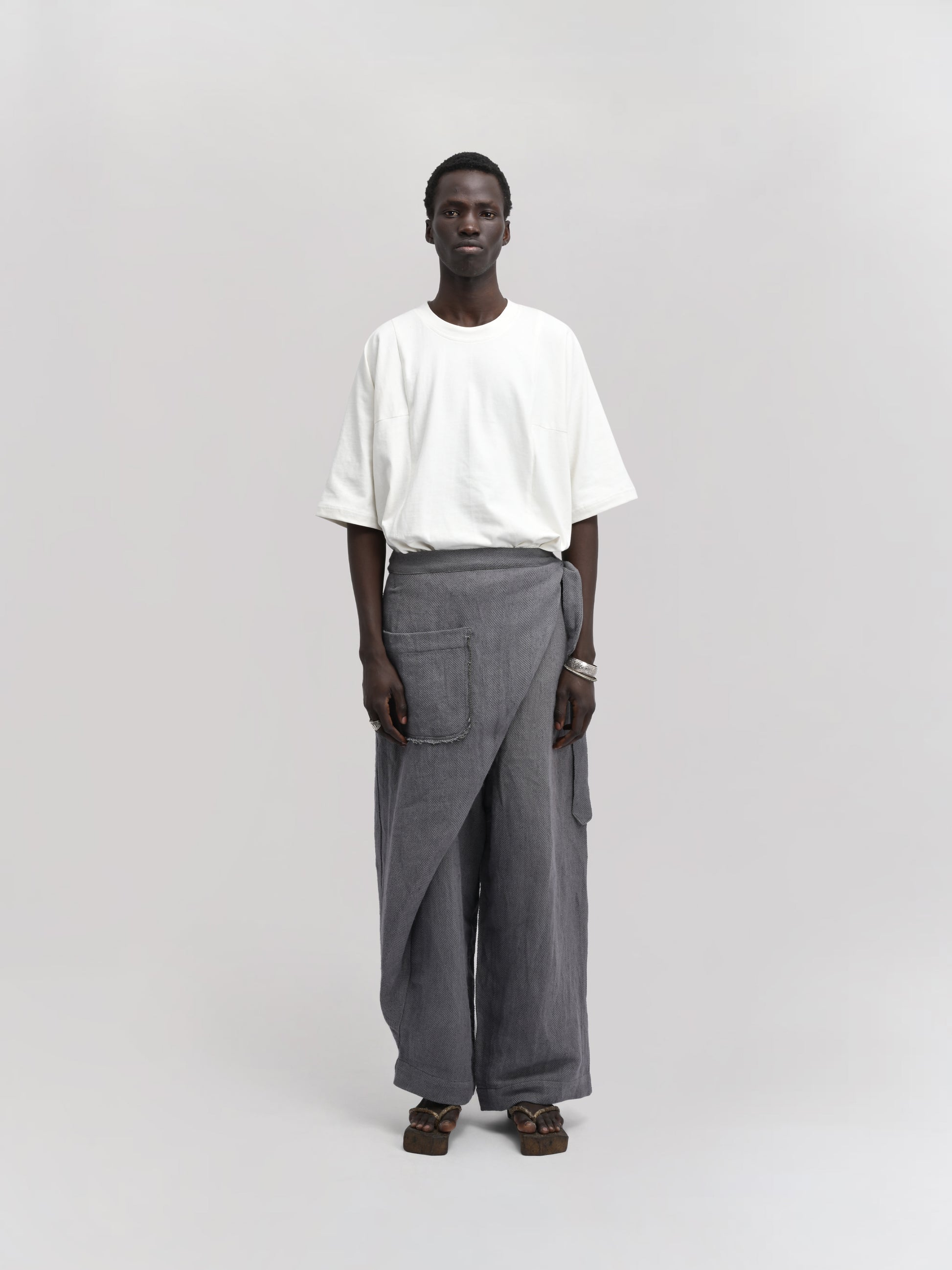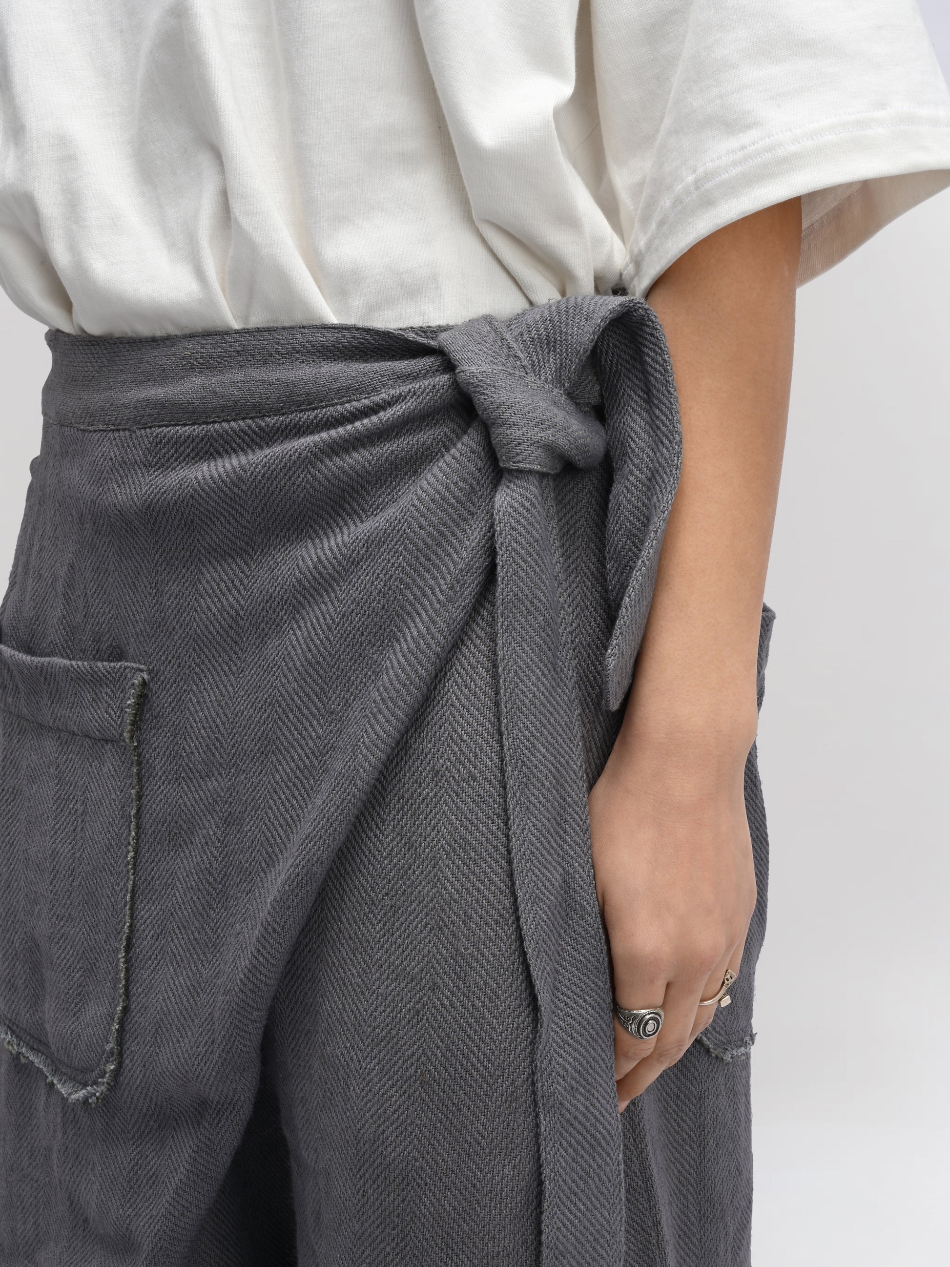 GARMENT – The Shepherd Pant blends artisanal weaving with practical design. Featuring an elasticated waist for comfort, a front wrap for a distinctive silhouette, and a secure tie-up knot, it delivers both style and functionality. Ideal for layering, its relaxed fit and versatile grey hue make it suitable for casual and refined looks alike.
