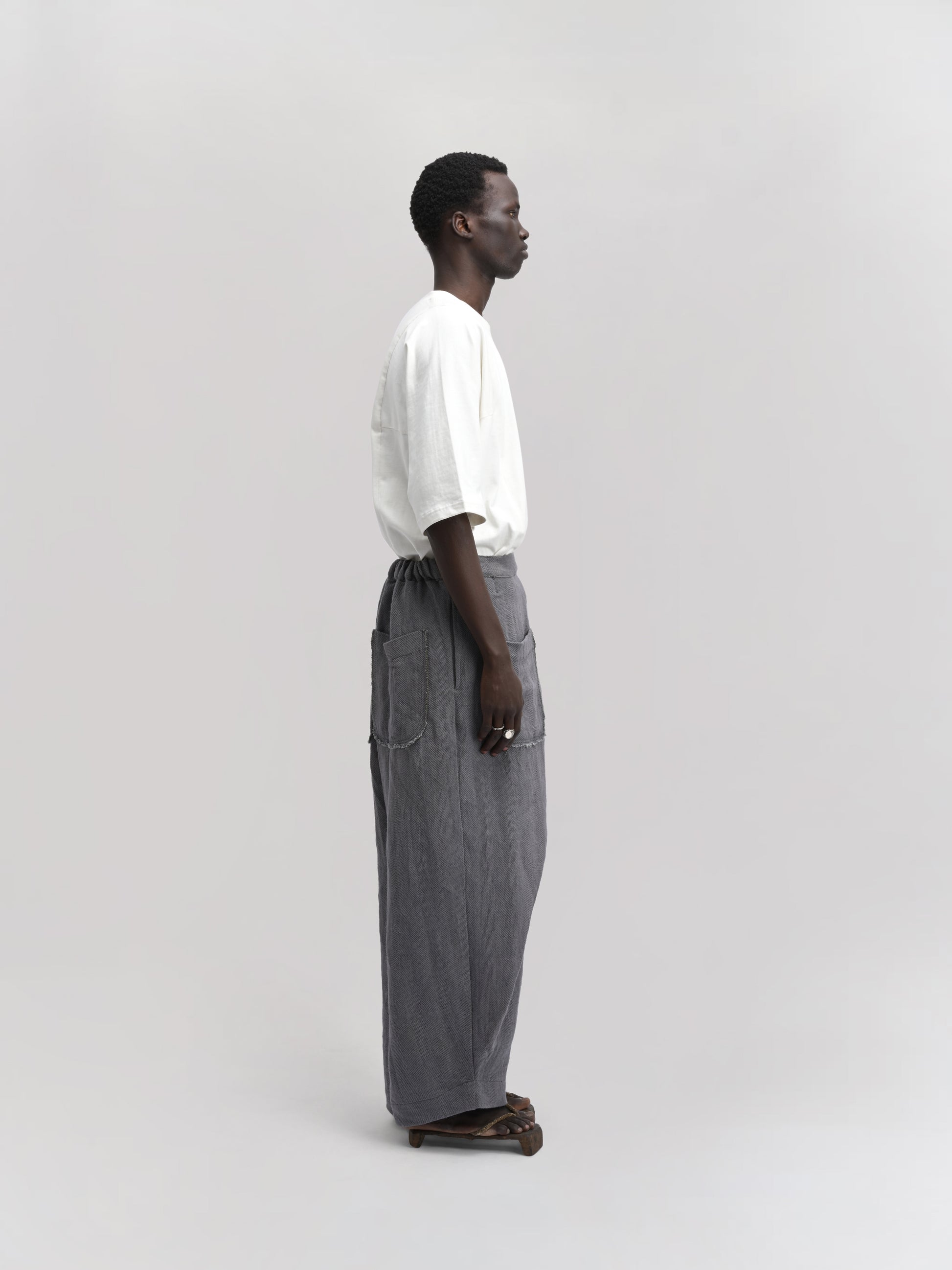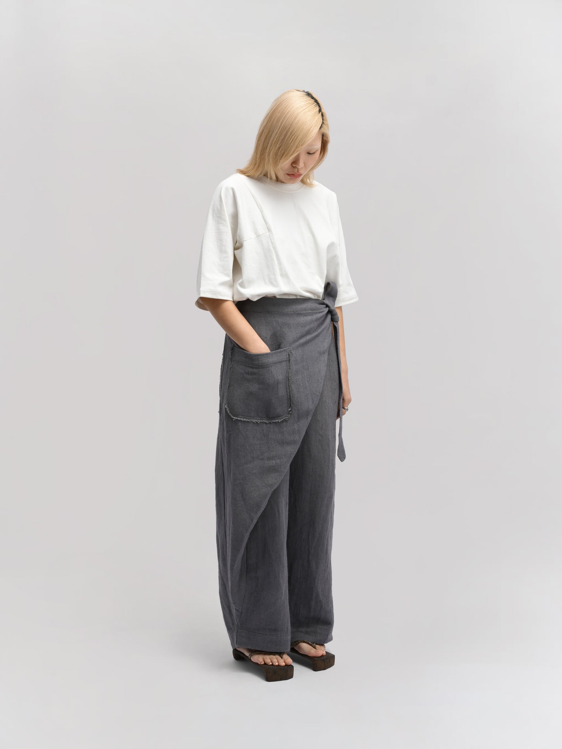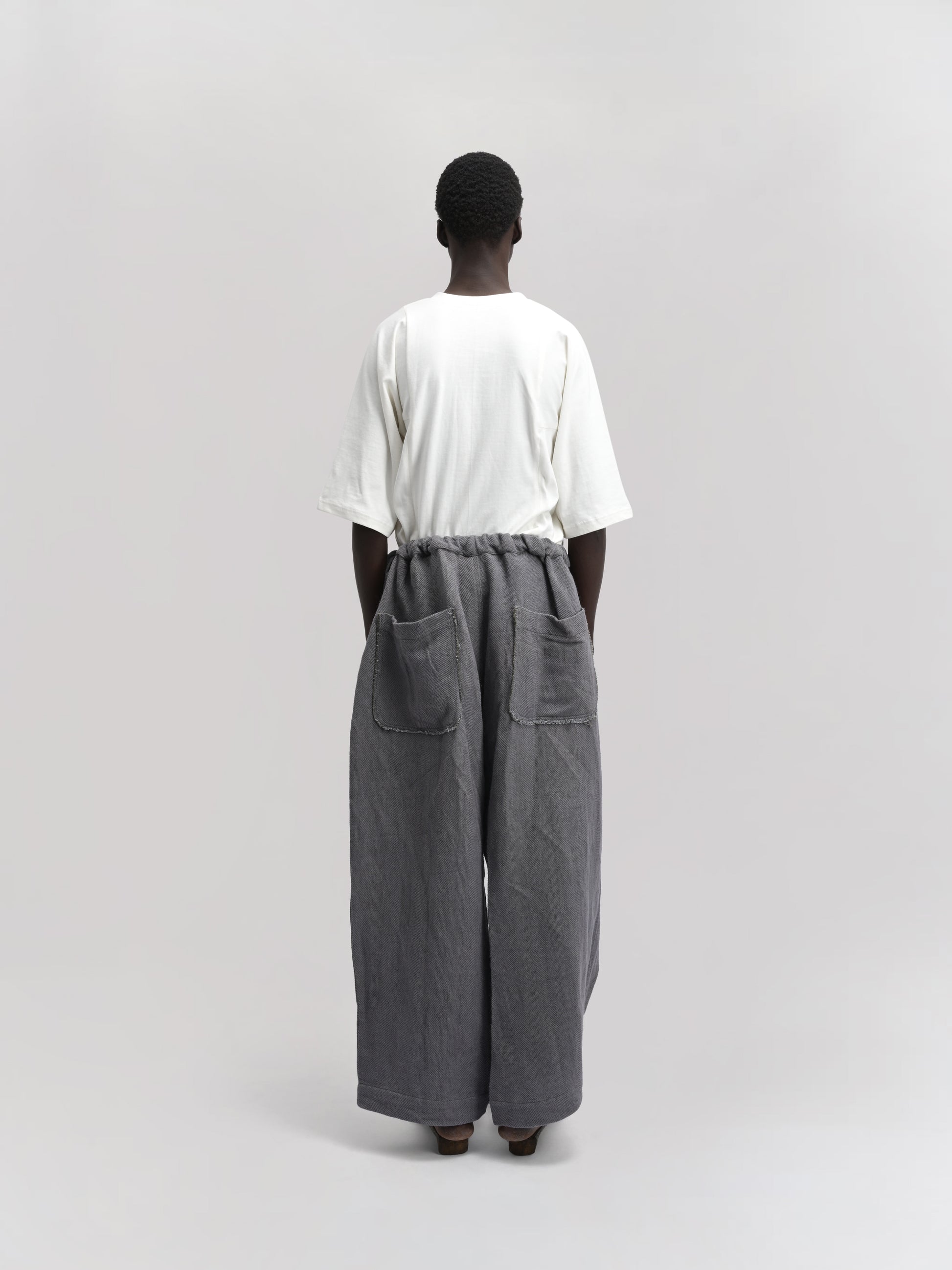 GARMENT – The Shepherd Pant blends artisanal weaving with practical design. Featuring an elasticated waist for comfort, a front wrap for a distinctive silhouette, and a secure tie-up knot, it delivers both style and functionality. Ideal for layering, its relaxed fit and versatile grey hue make it suitable for casual and refined looks alike.