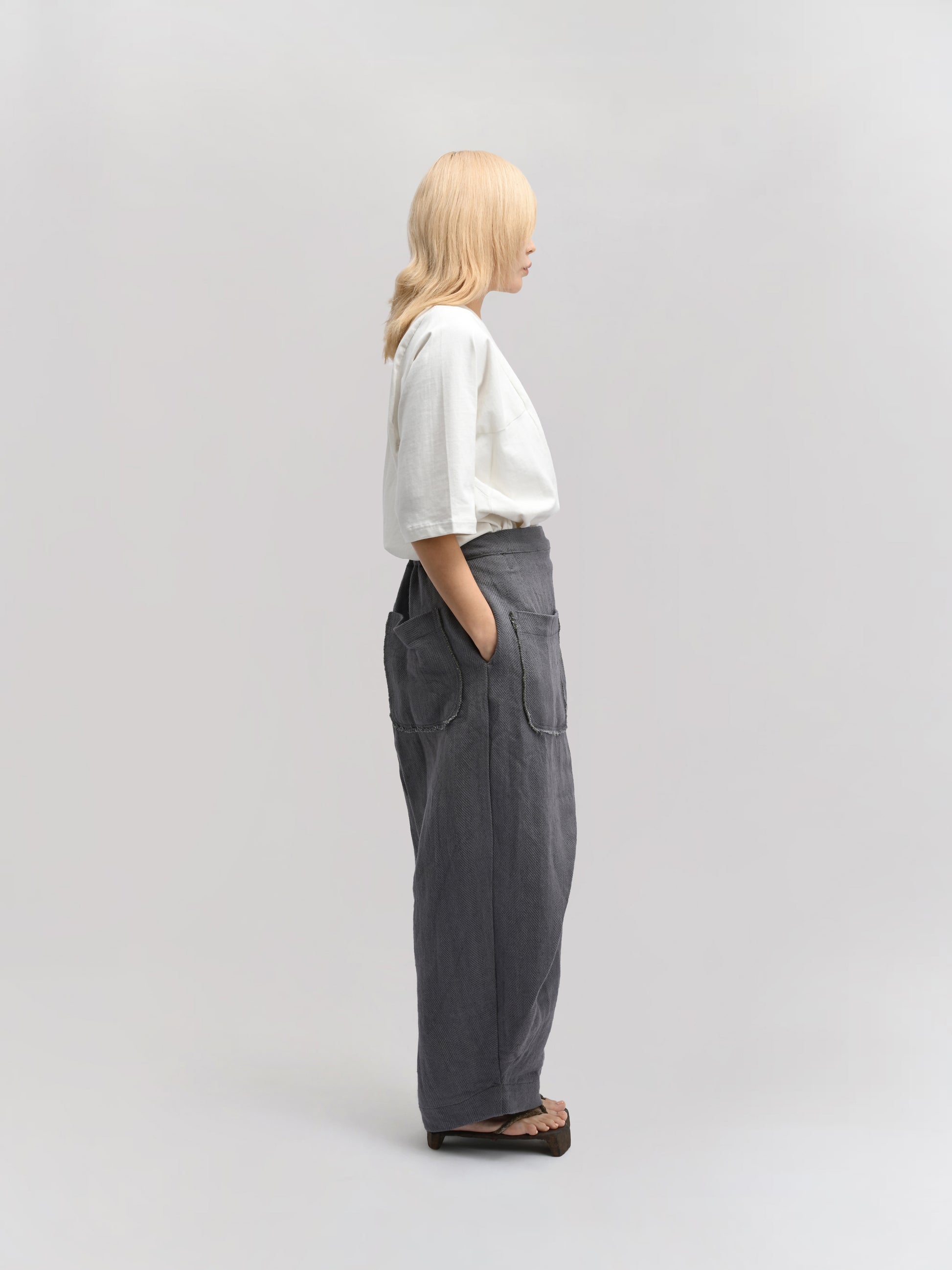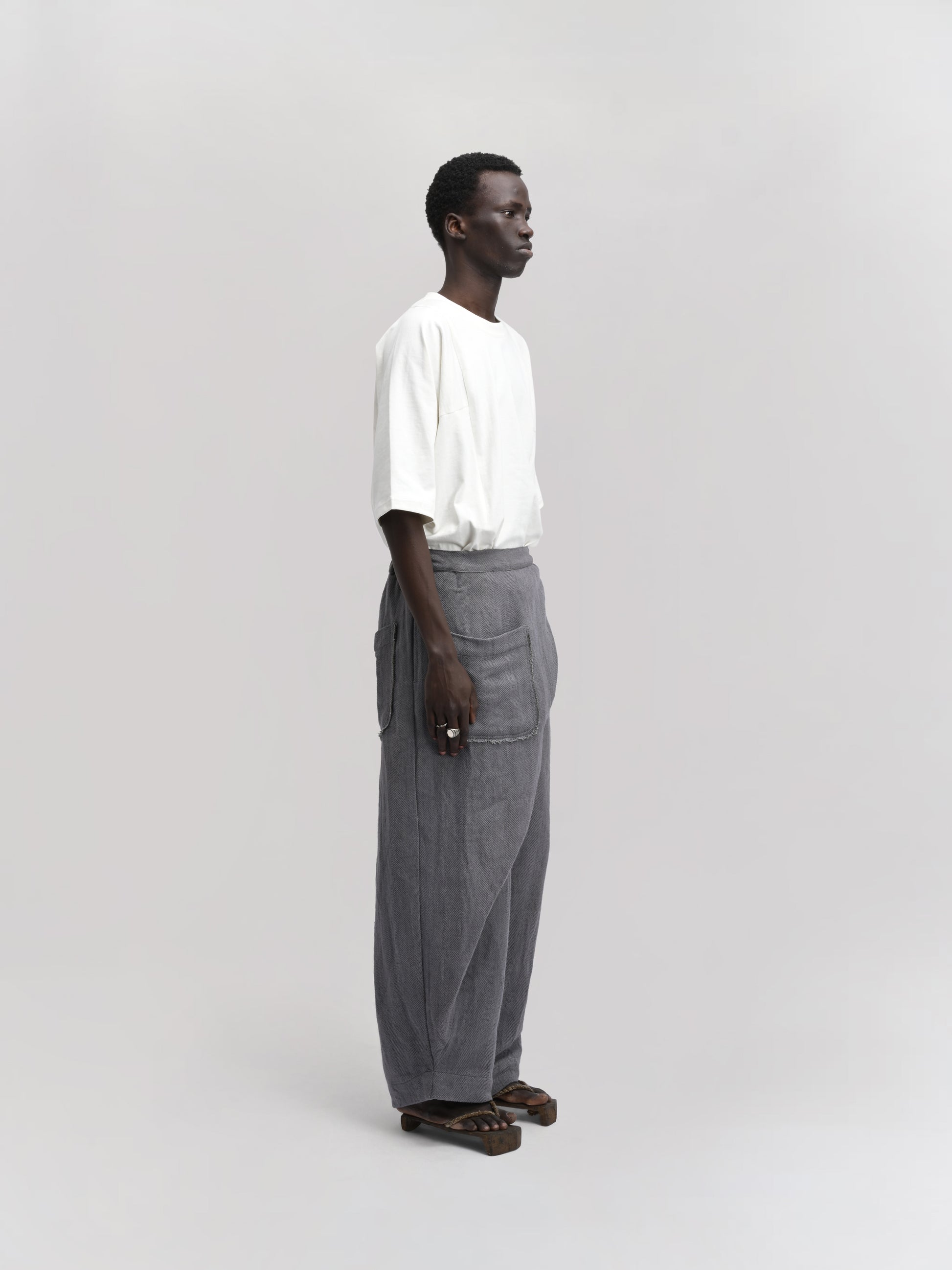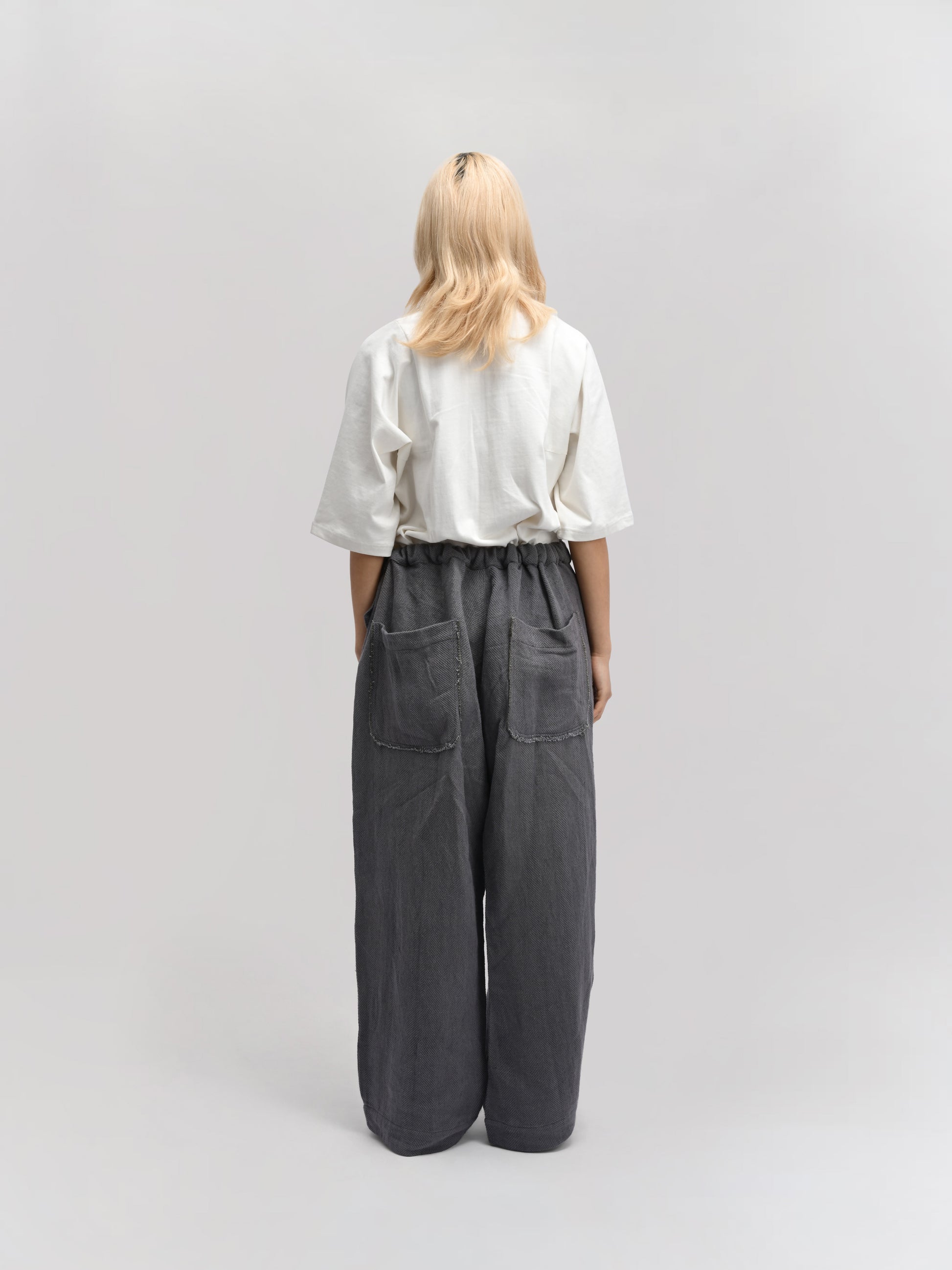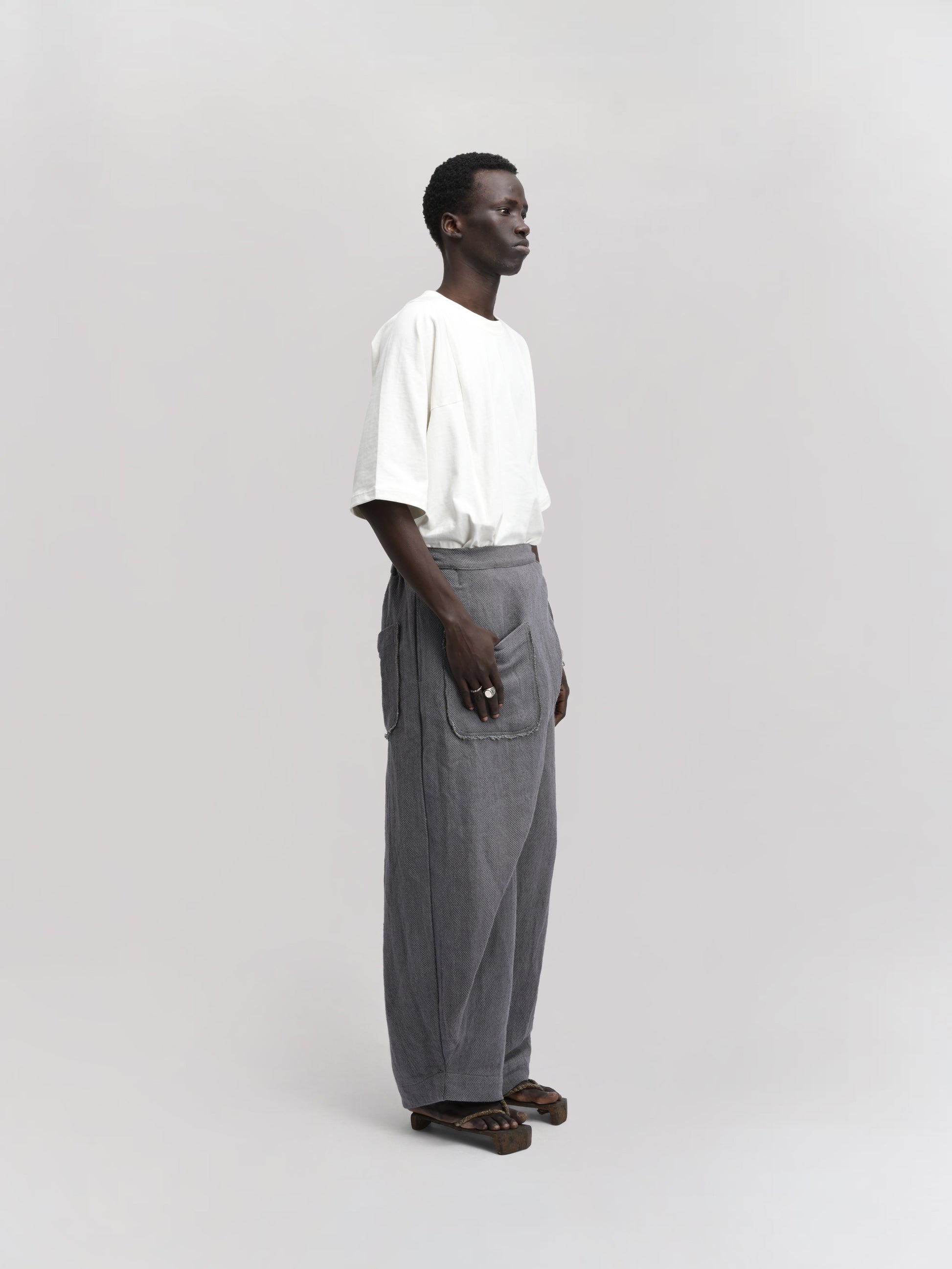 GARMENT – The Shepherd Pant blends artisanal weaving with practical design. Featuring an elasticated waist for comfort, a front wrap for a distinctive silhouette, and a secure tie-up knot, it delivers both style and functionality. Ideal for layering, its relaxed fit and versatile grey hue make it suitable for casual and refined looks alike.