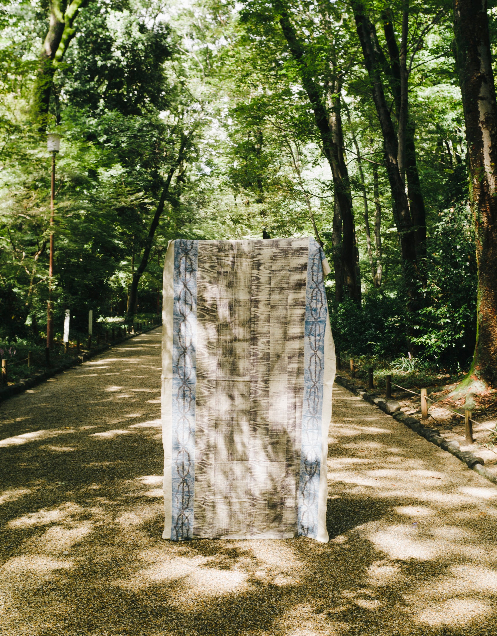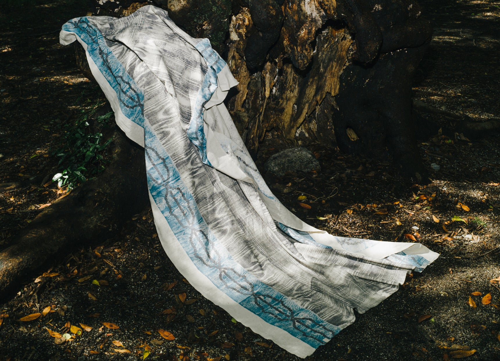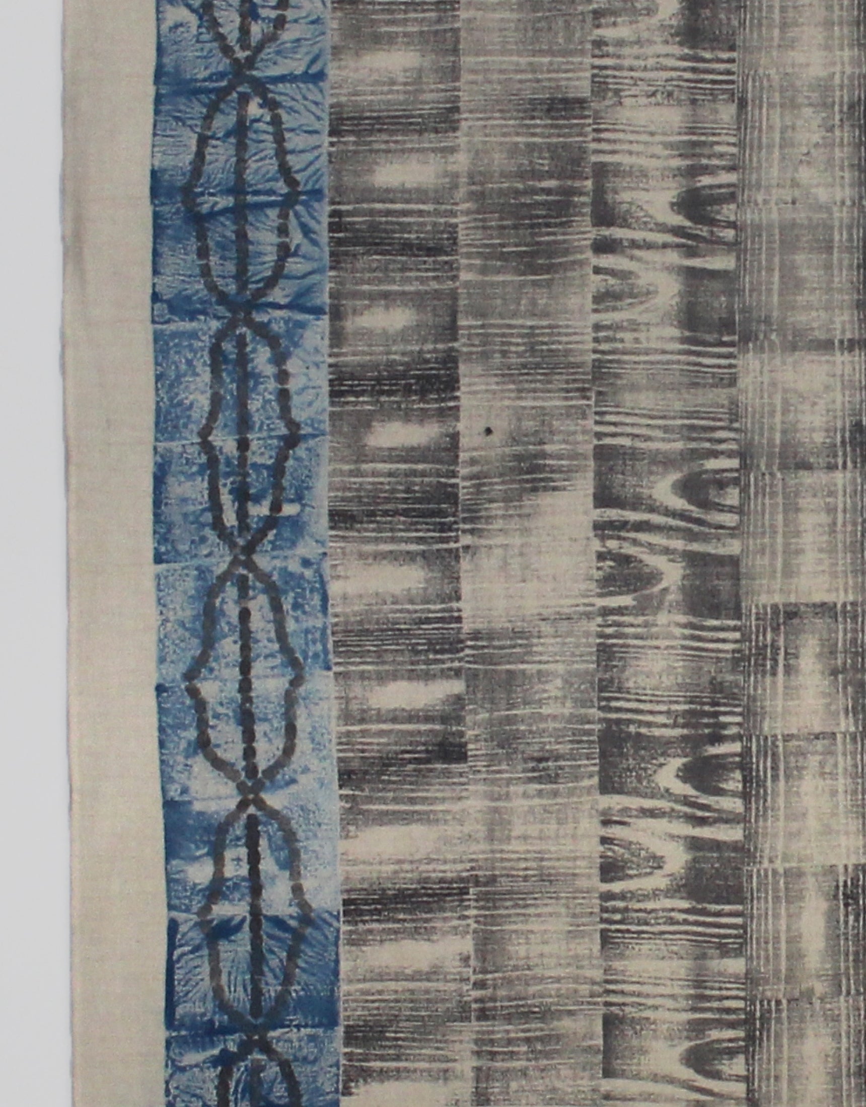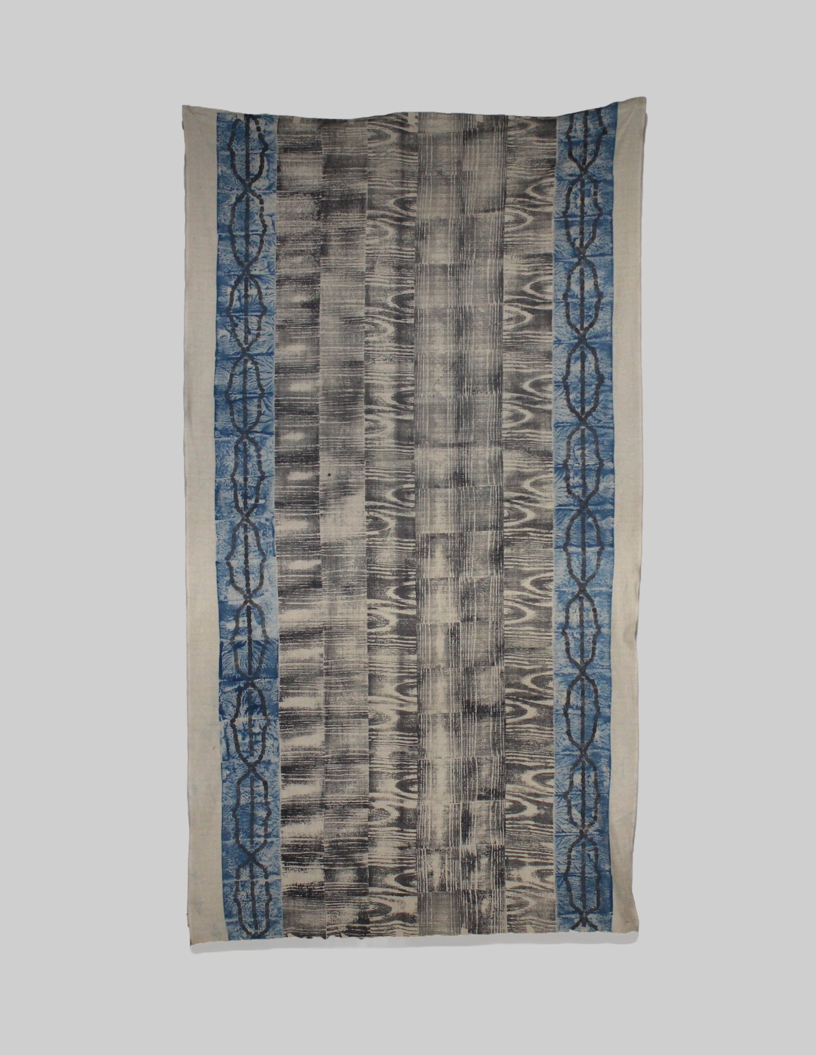 The double Ayusi motif overlayed on an indigo border with wood grain pattern sitting between. The popular graphic pattern which translates to a shape marked with a thorn is made with all natural colours and natural finish. The material has a light and tighter weave, giving a smooth paper-like feel which is comforting to the skin. The contemporary approach of block print and dyeing the Kala involves primitive utensils made from wood and using the index finger to create intense markings which fade with movement to create the symbols.
