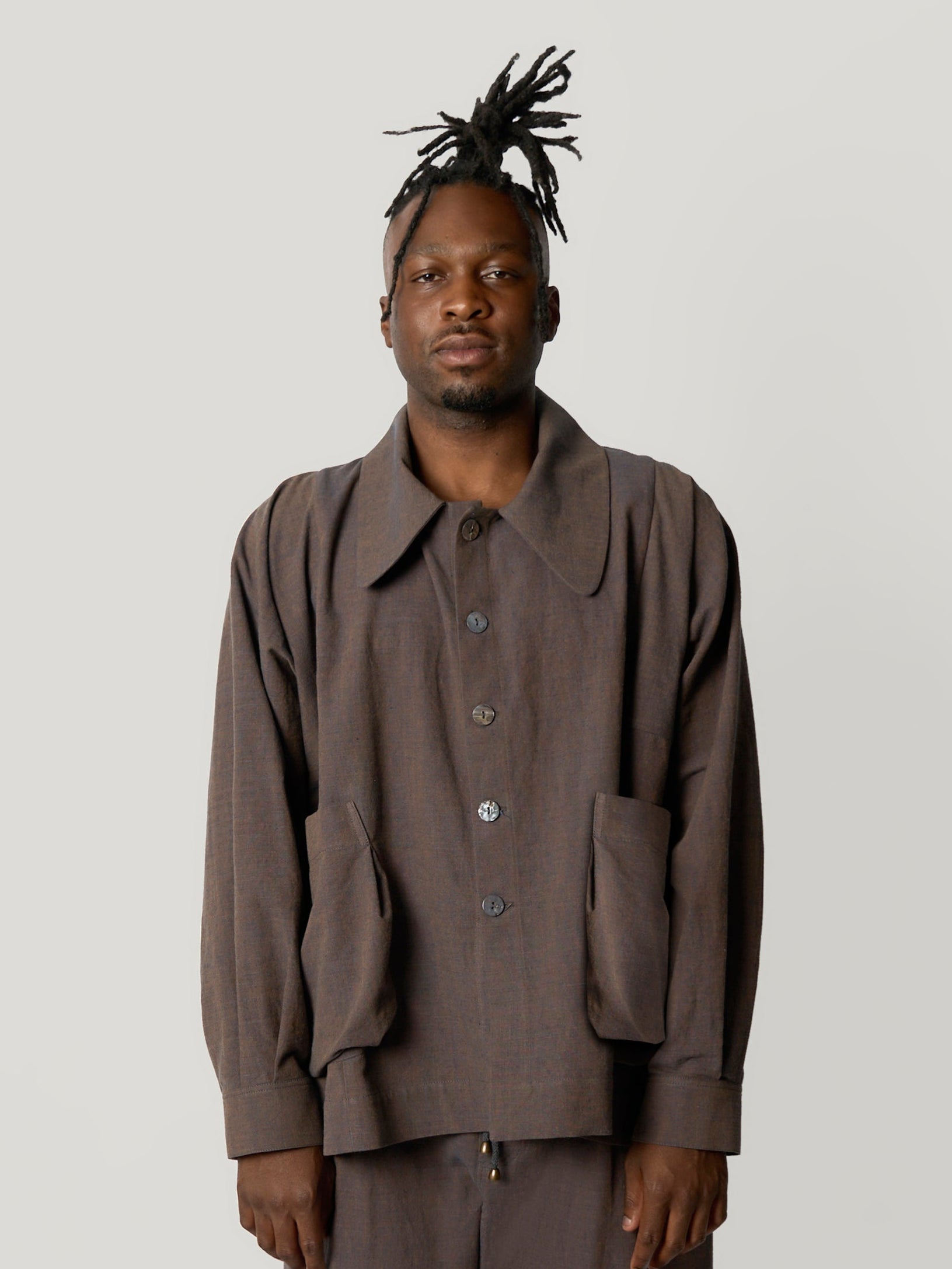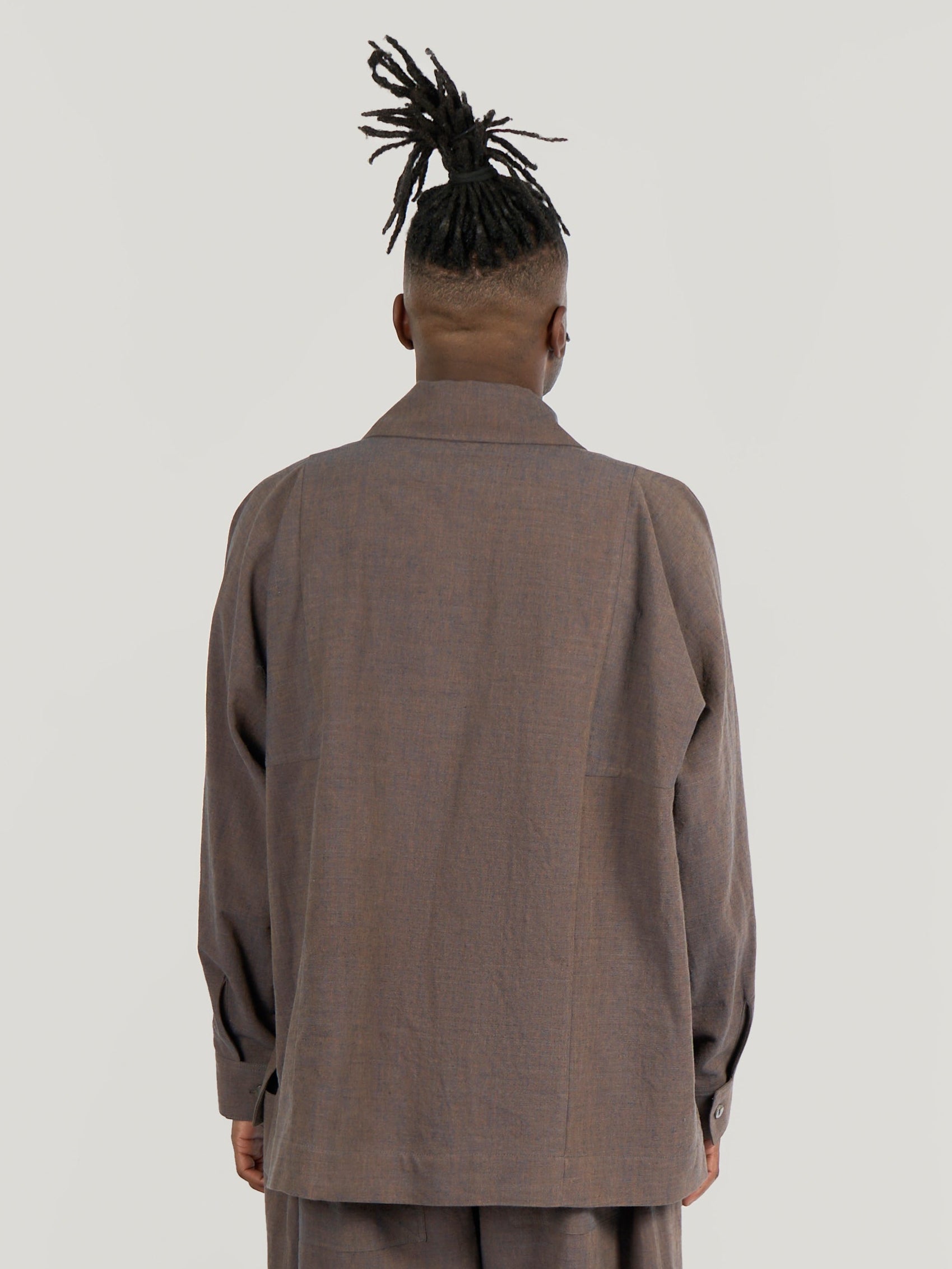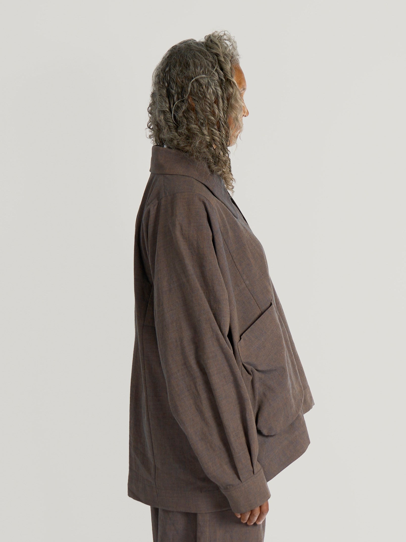 GARMENT – A classic jacket with a relaxed, structured form, defined by an oversized collar and roomy front pockets. The straight cut and generous shape give it an easy, utilitarian character while maintaining a balanced silhouette. Minimal finishing allows the fabric’s depth of colour to stand out, making the piece versatile and understated.