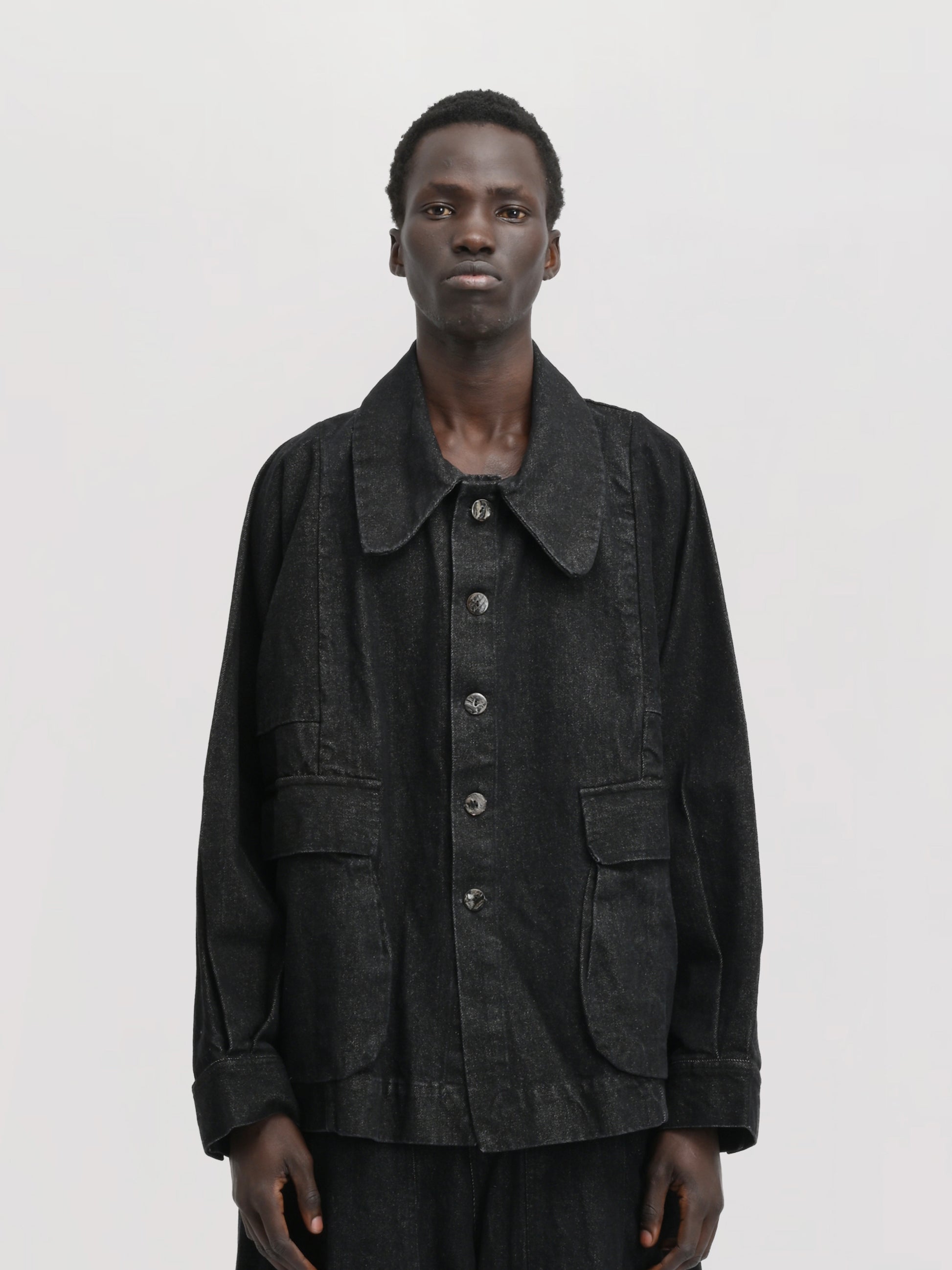 MATERIALS – Crafted from authentic stonewashed Kojima denim in a deep black tone, this fabric offers a soft, broken-in feel while retaining the durability and structure denim is known for. It is finished with natural shell buttons for a refined, organic touch.