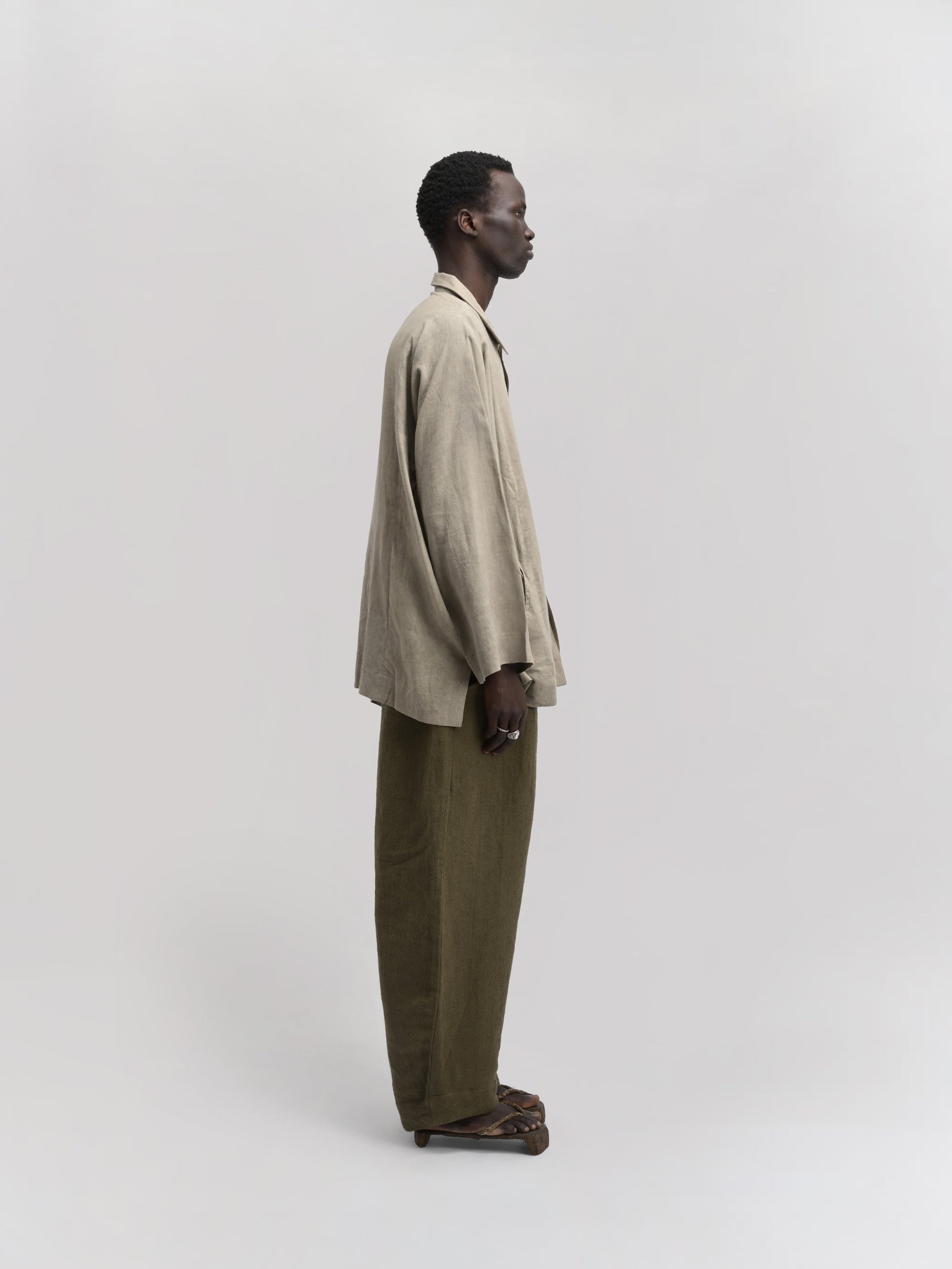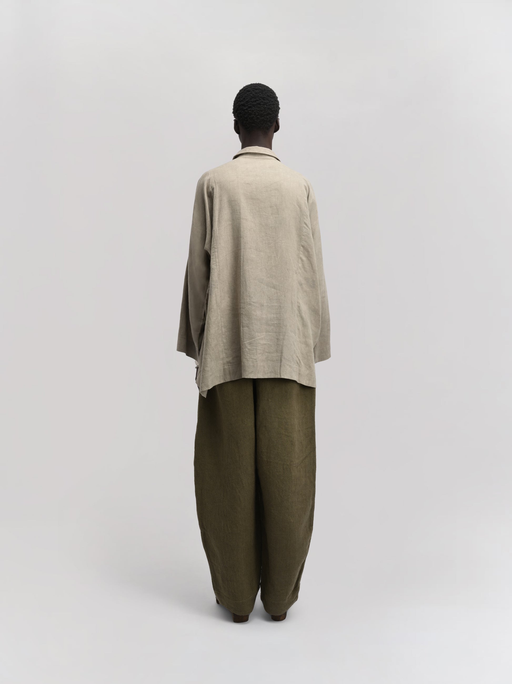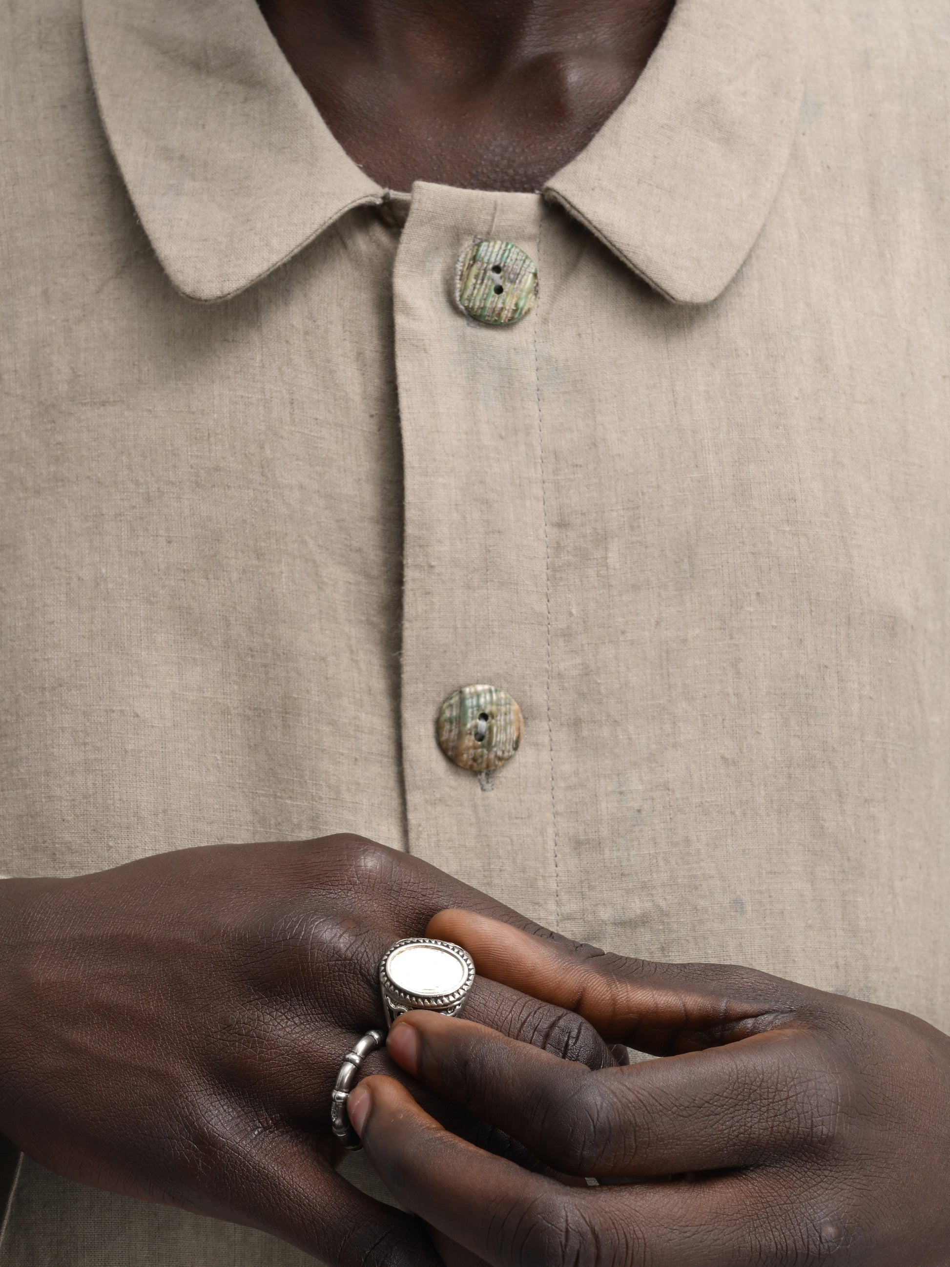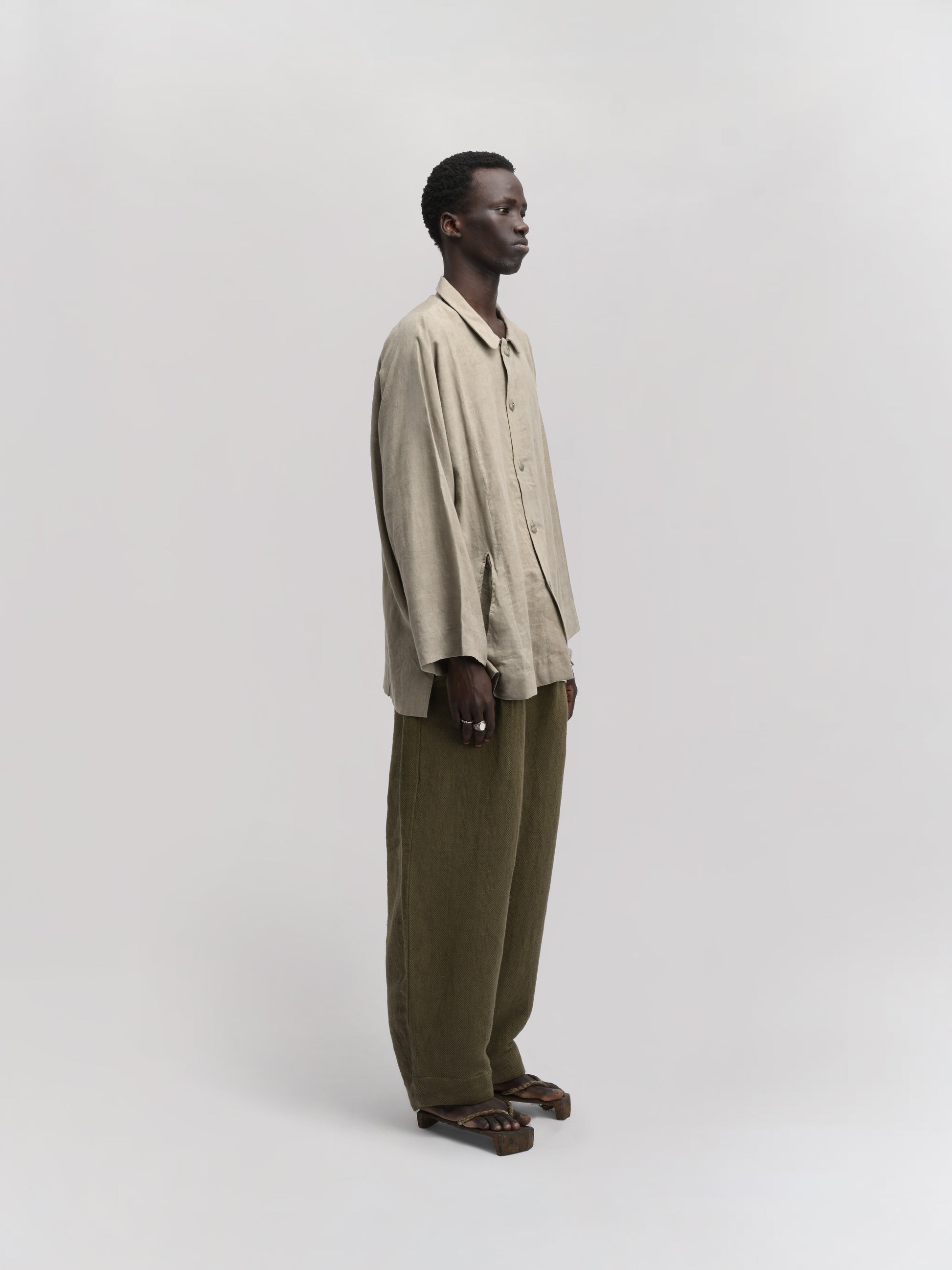 MATERIALS – Crafted from a breathable linen–cotton blend, naturally dyed in a soothing light green tone. The fabric offers a soft handfeel with the durability of cotton and the airy drape of linen. Finished with lustrous natural shell buttons for a subtle, organic detail.