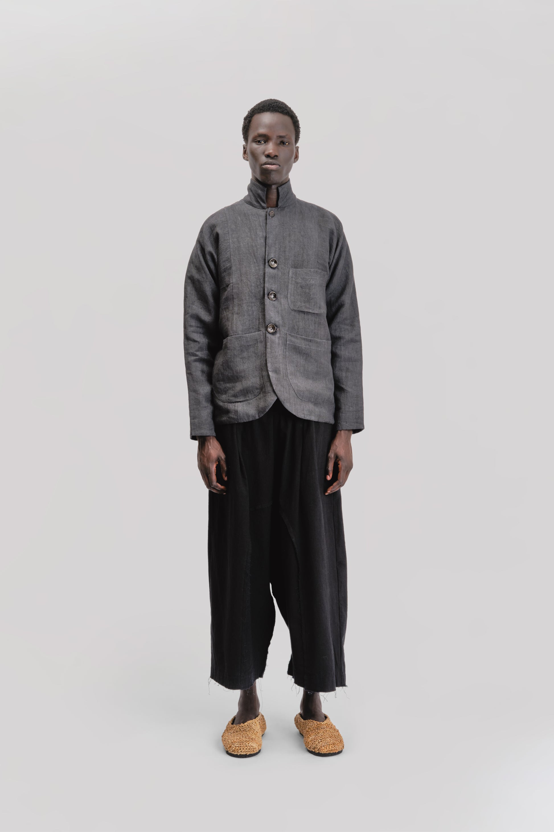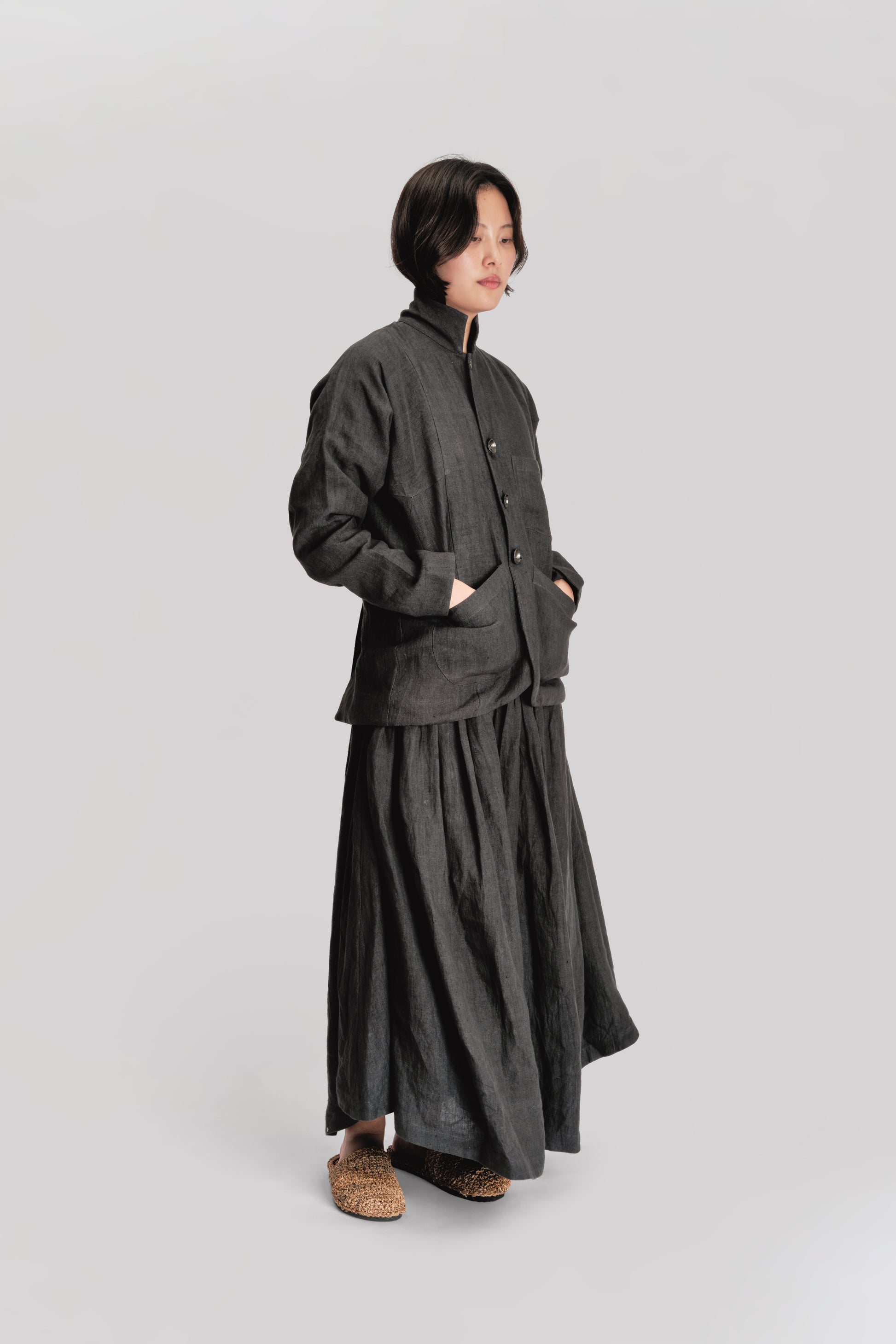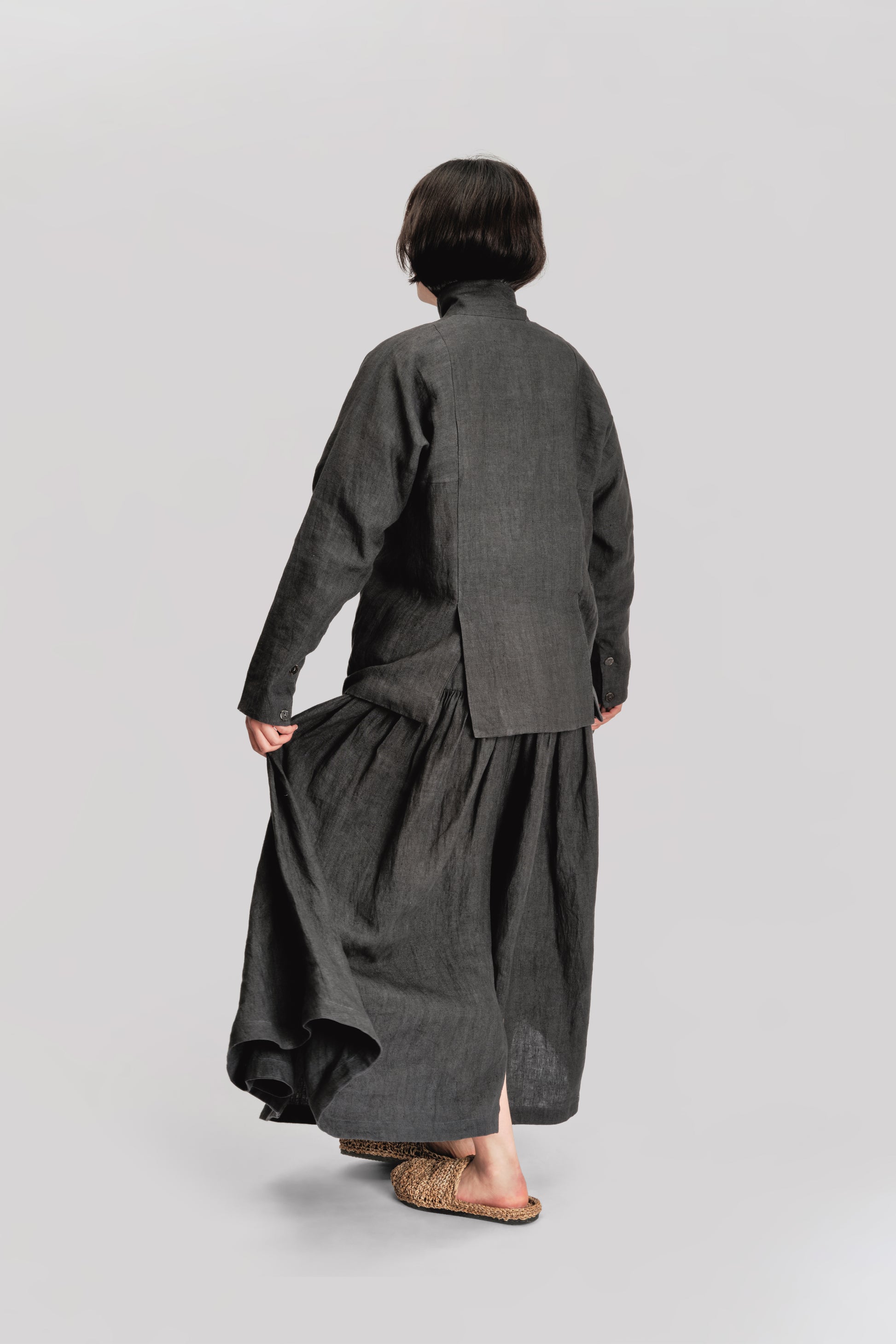 MATERIALS – Crafted from black Japanese stonewashed linen, lined in organic cotton for structure and comfort. The stone washing process lends the fabric a softened, slightly faded depth of tone and a supple drape that feels broken-in from the first wear.