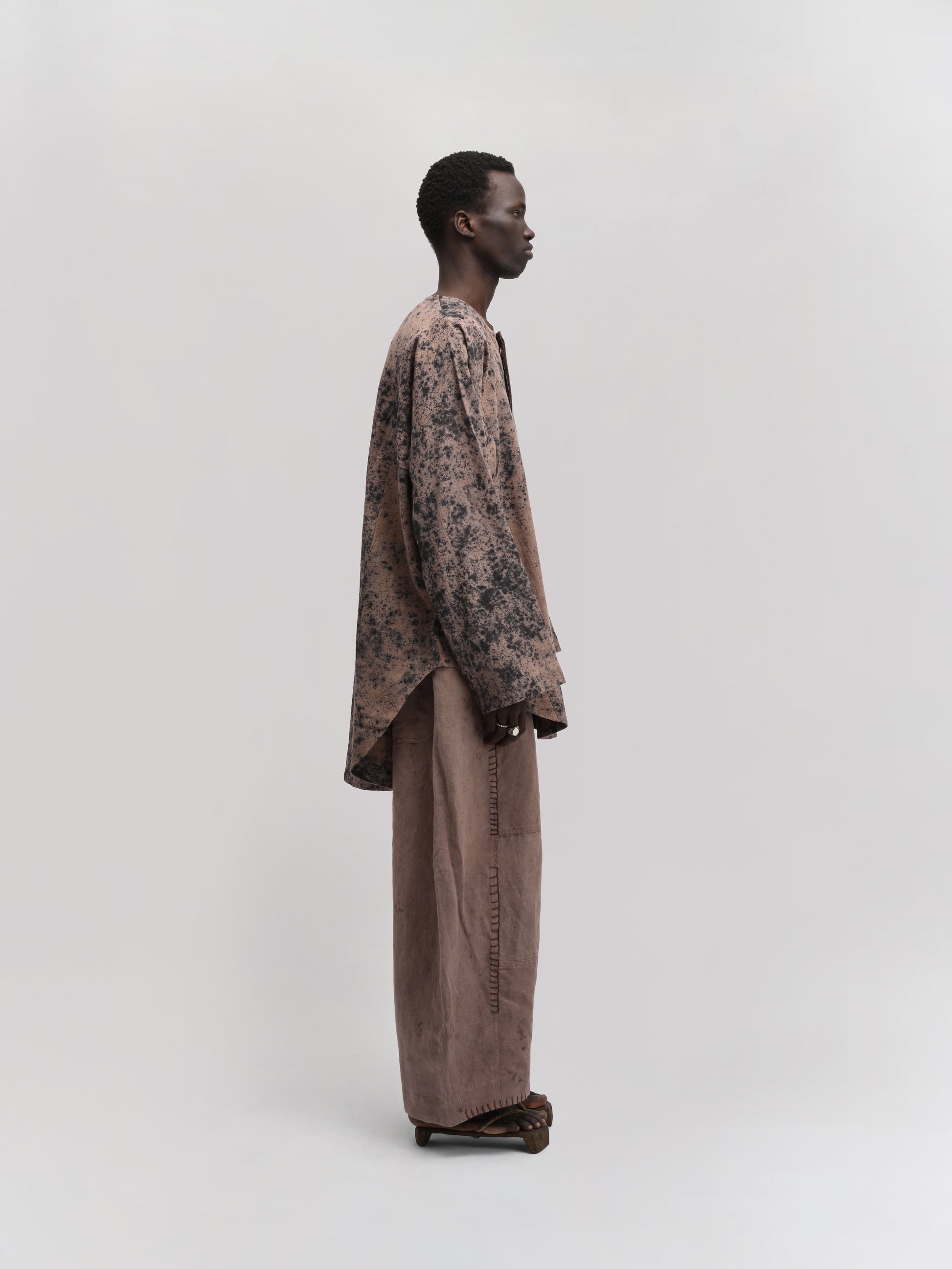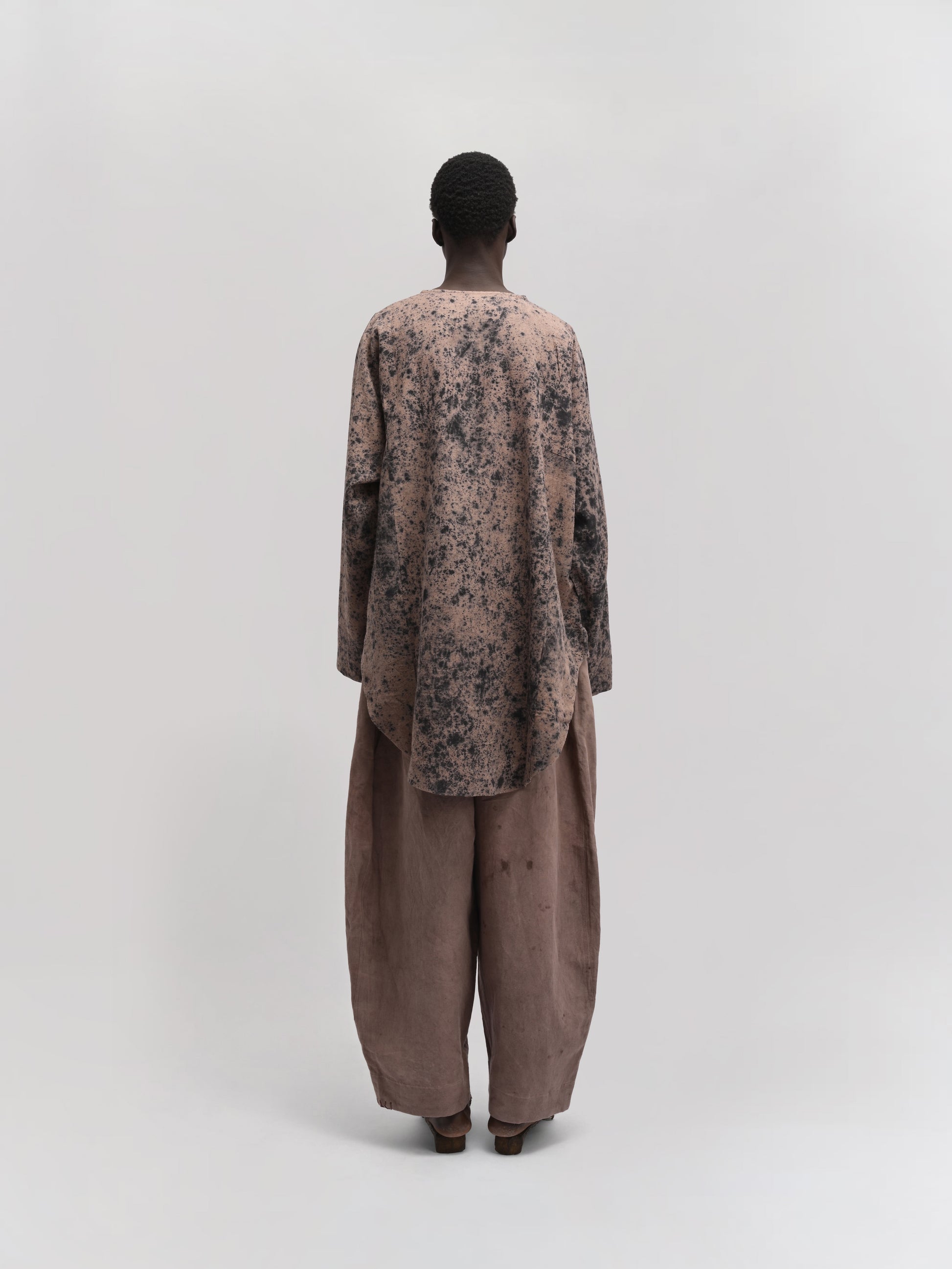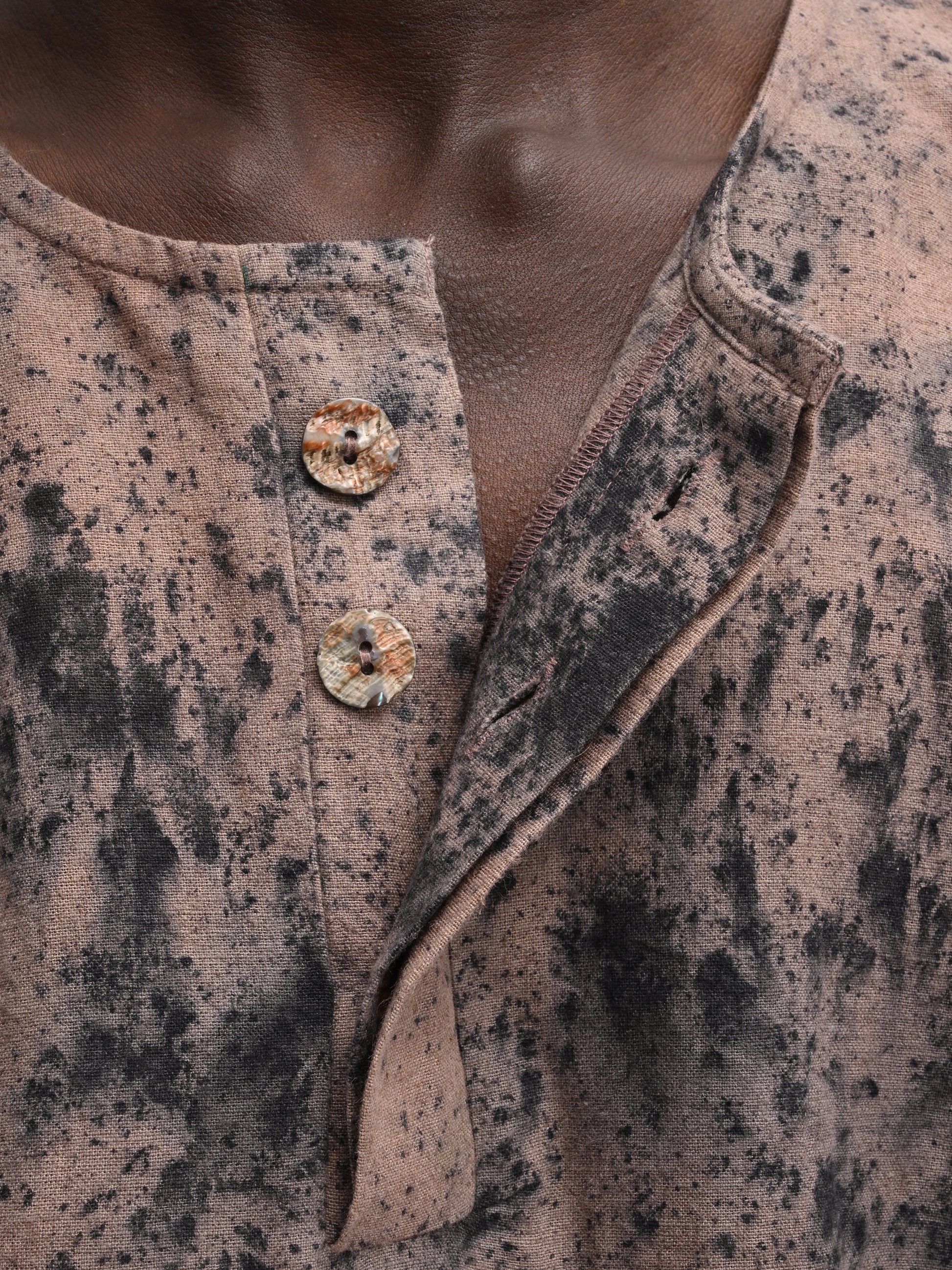 MATERIALS – Crafted from a breathable linen-cotton blend, naturally rain-dyed in contrasting black and clay tones. Each shirt is detailed with natural shell buttons, offering a subtle, refined touch.