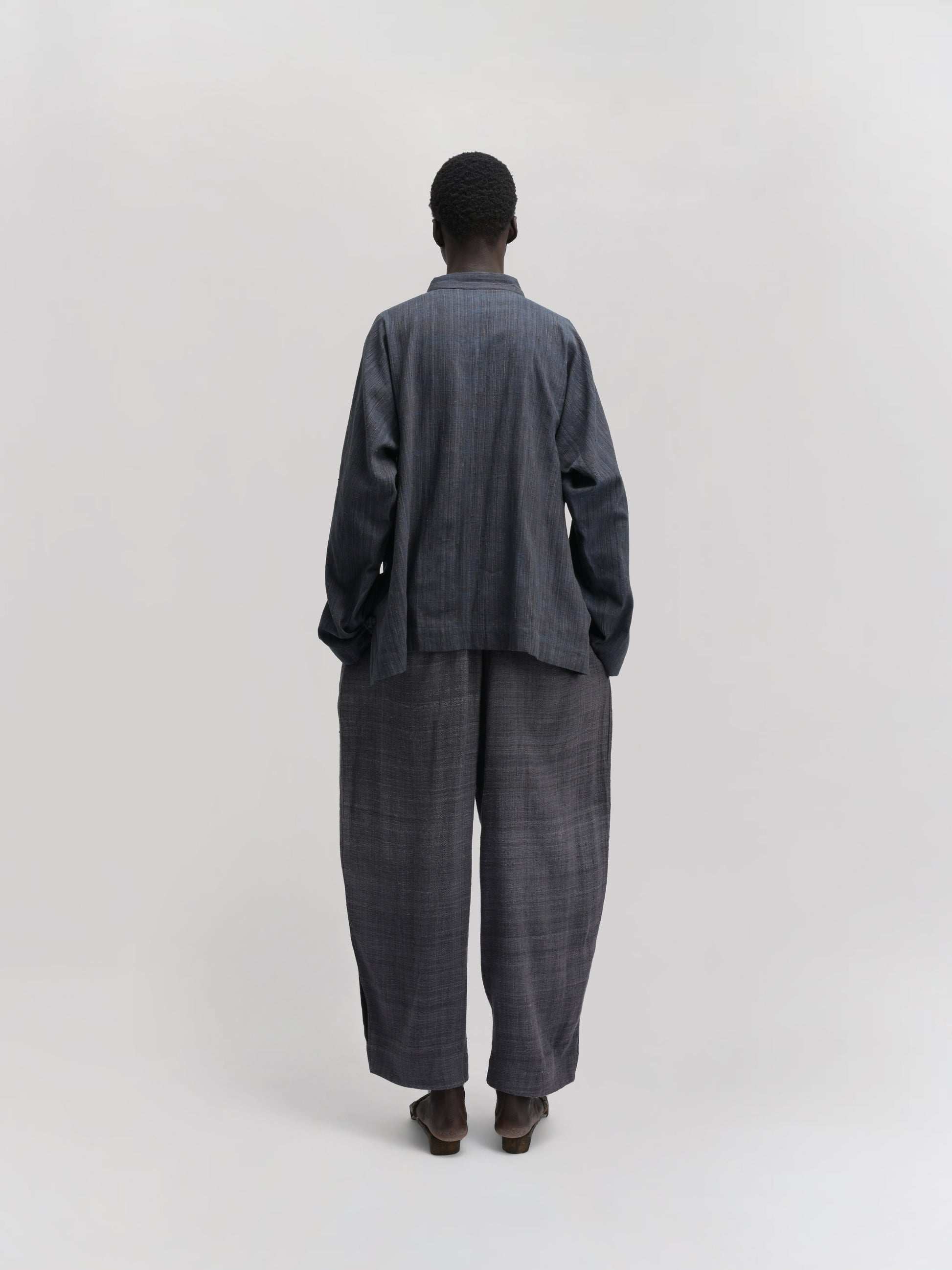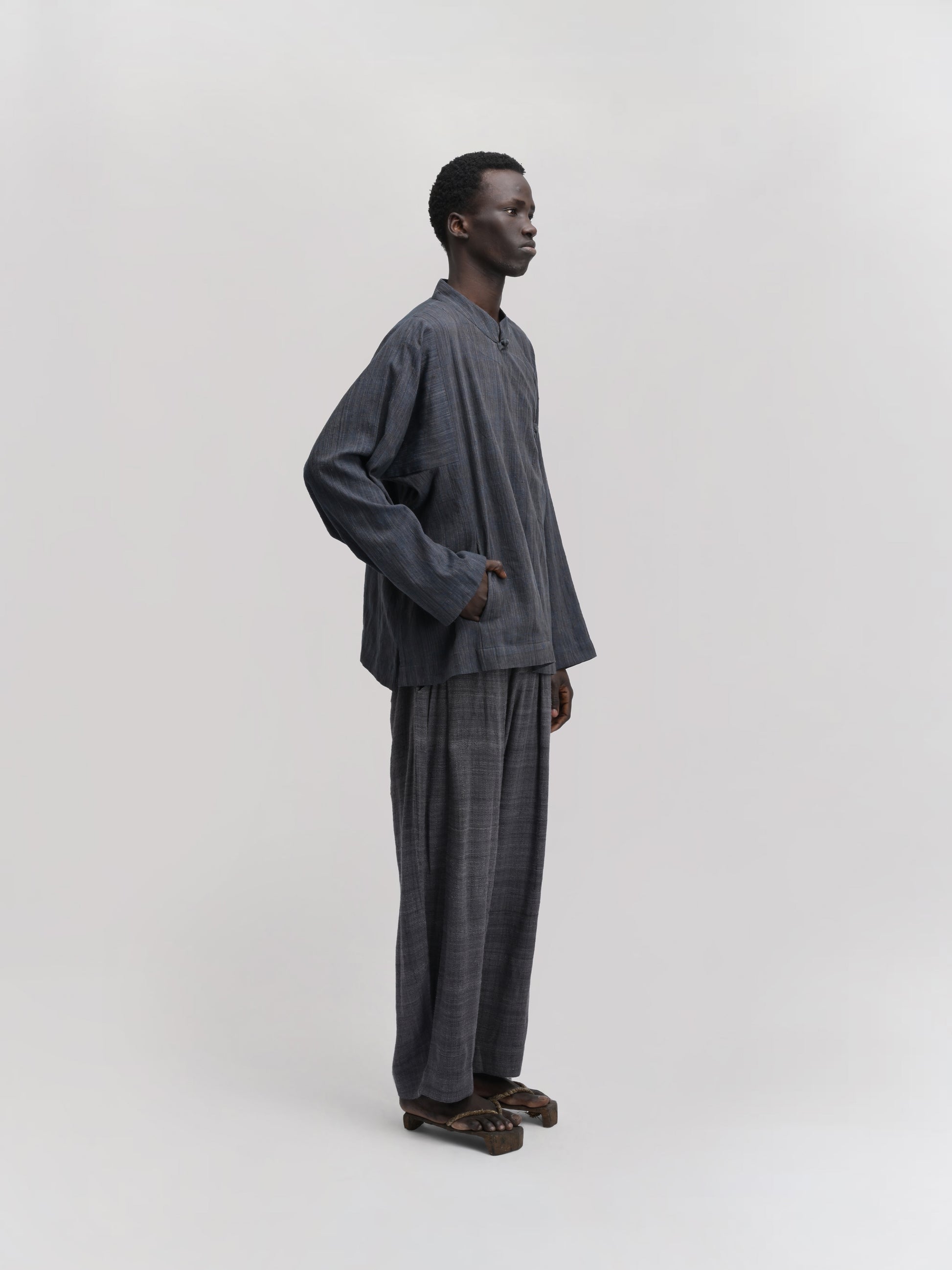 MATERIALS – Crafted from handwoven Kala cotton, yarn-dyed in a rich blend of Gray tone. Each jacket is adorned with hand-stitched fabric buttons, offering a subtle, artisanal charm.