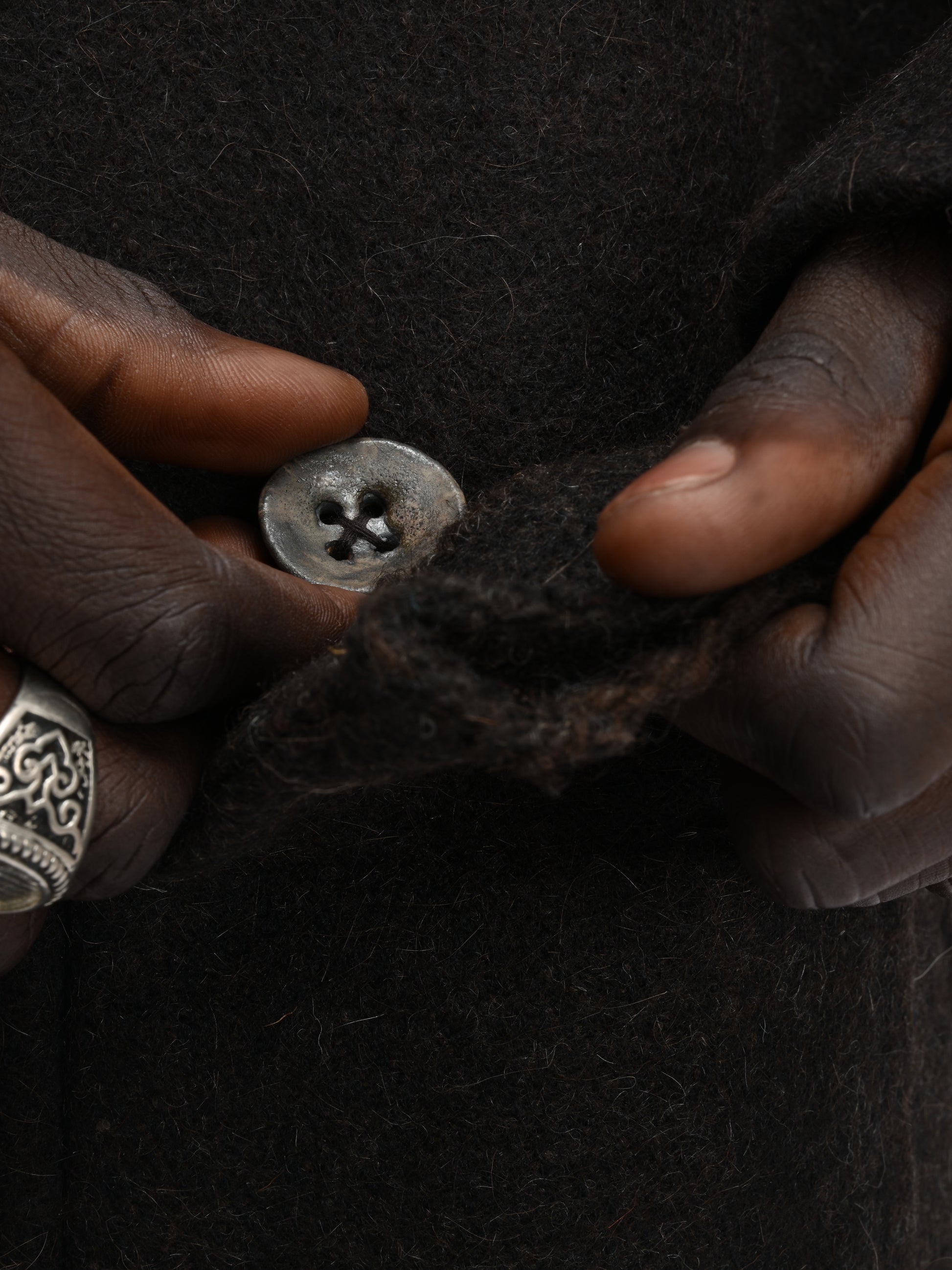 MATERIALS – Handwoven on traditional looms, hand-felted yak and sheep wool in a rich dark chocolate hue. Crafted by skilled artisans group, working from 1960, using black yarn and dark brown yarn in the Himalayan Plateau. Each piece is finished with natural ceramic buttons glazed in a rough black and shell buttons to match.