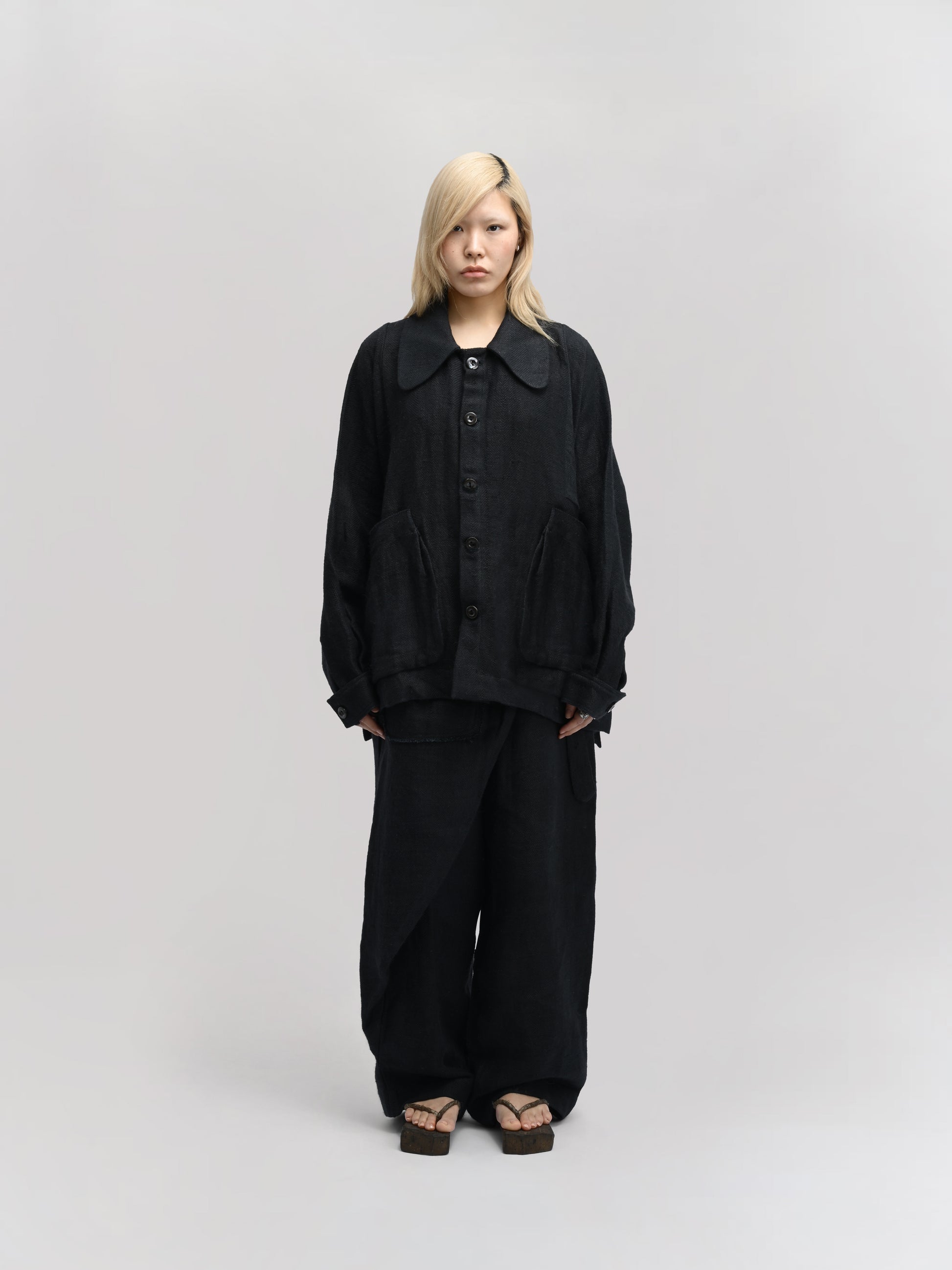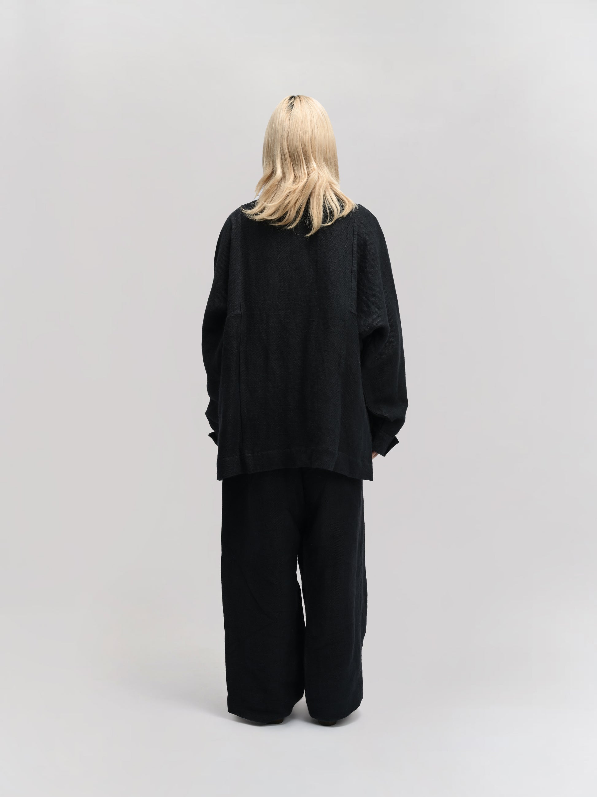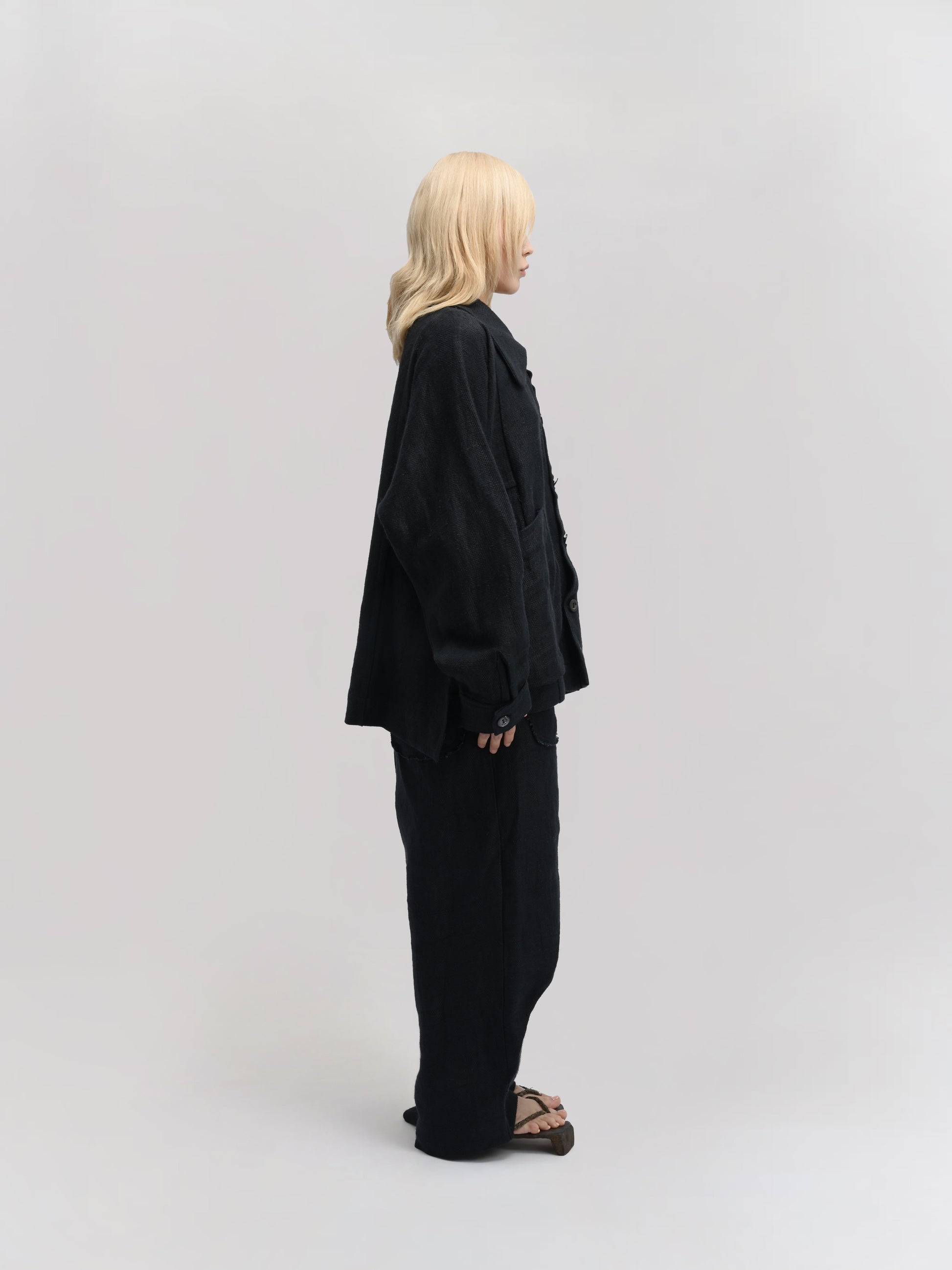MATERIALS – Crafted from handwoven organic cotton, naturally dyed in a rich charcoal black. The fabric is soft yet durable, showcasing subtle variations from the artisanal weaving process. Finished with natural shell buttons for a clean, classic touch.