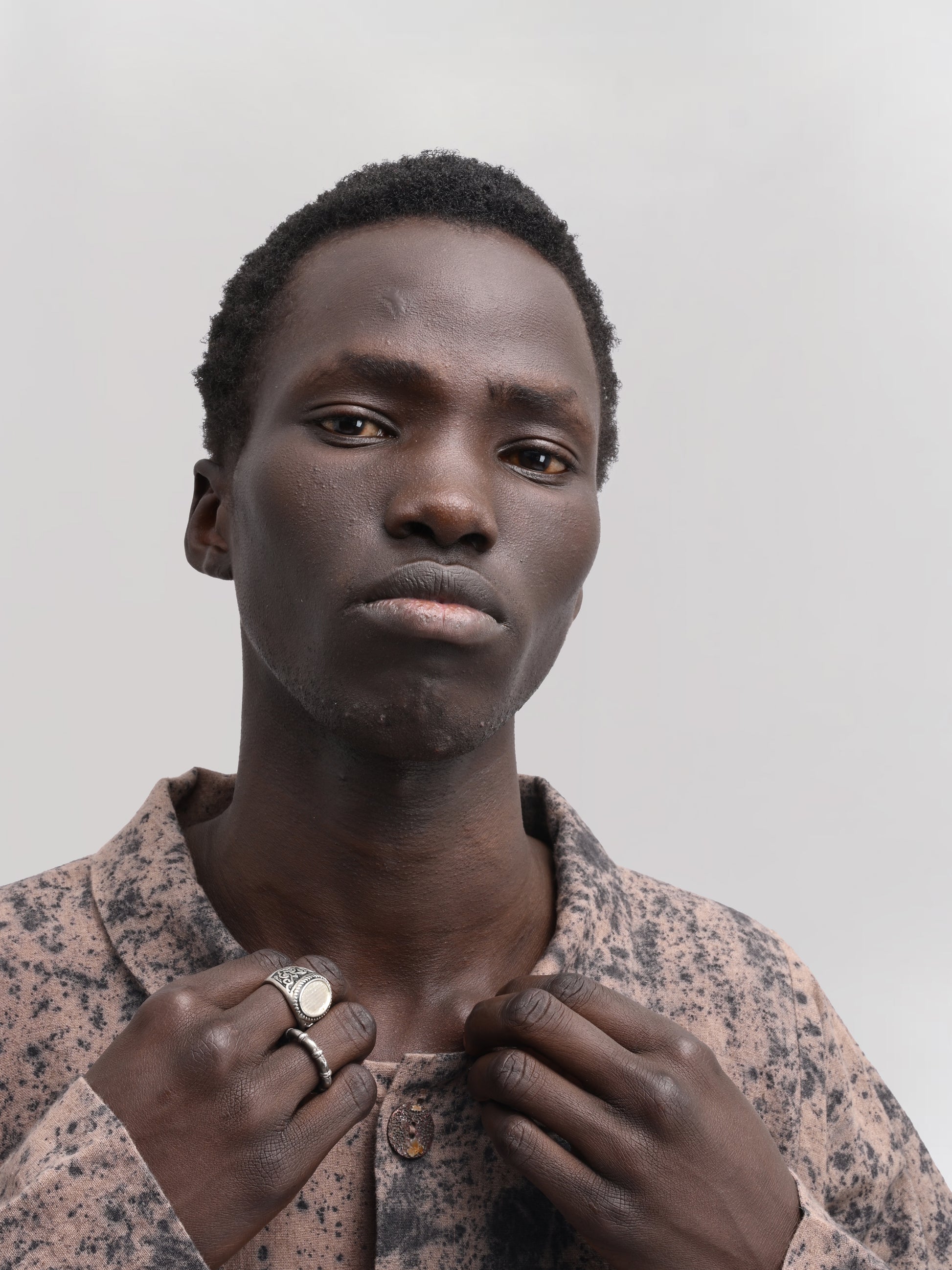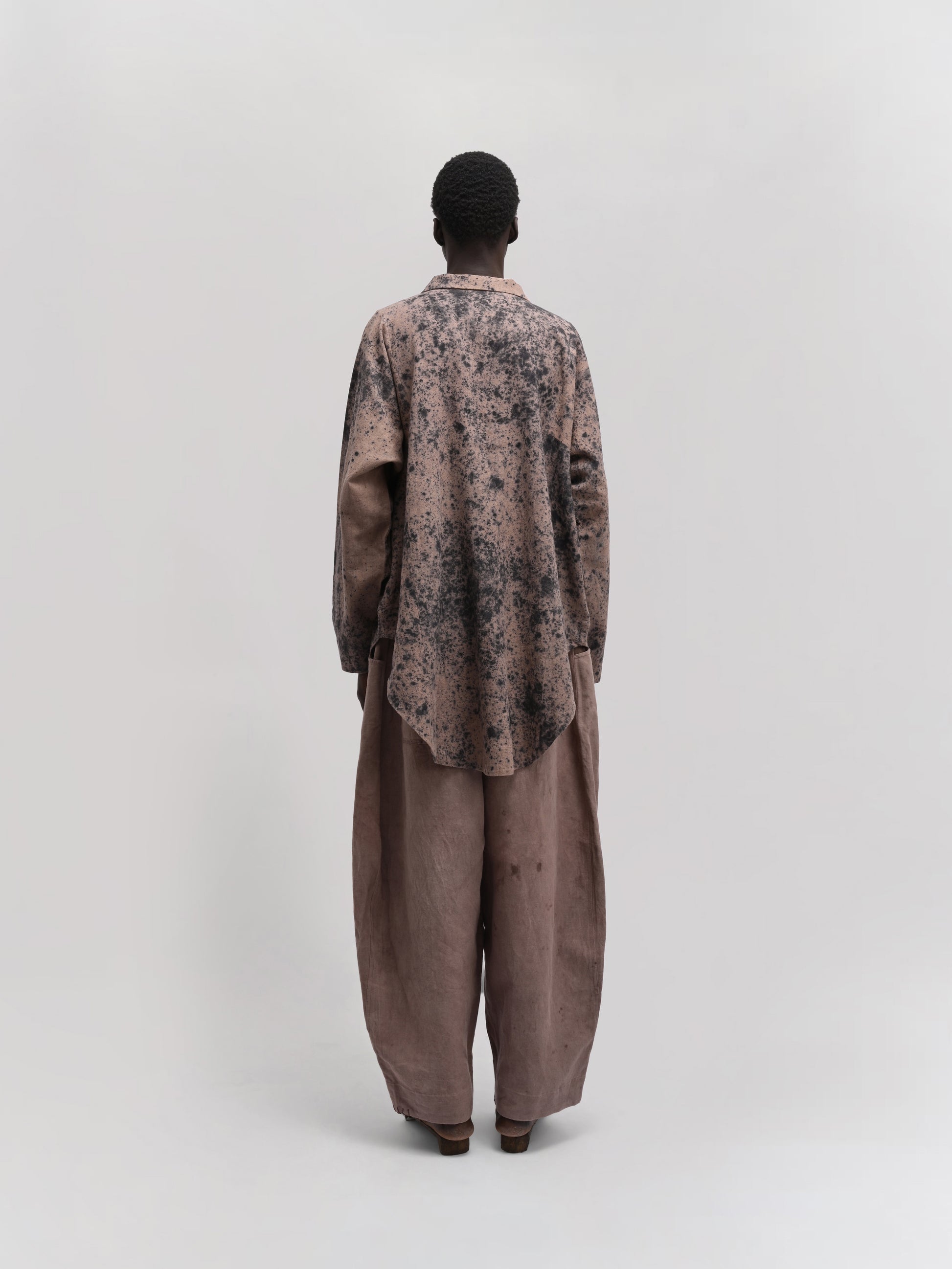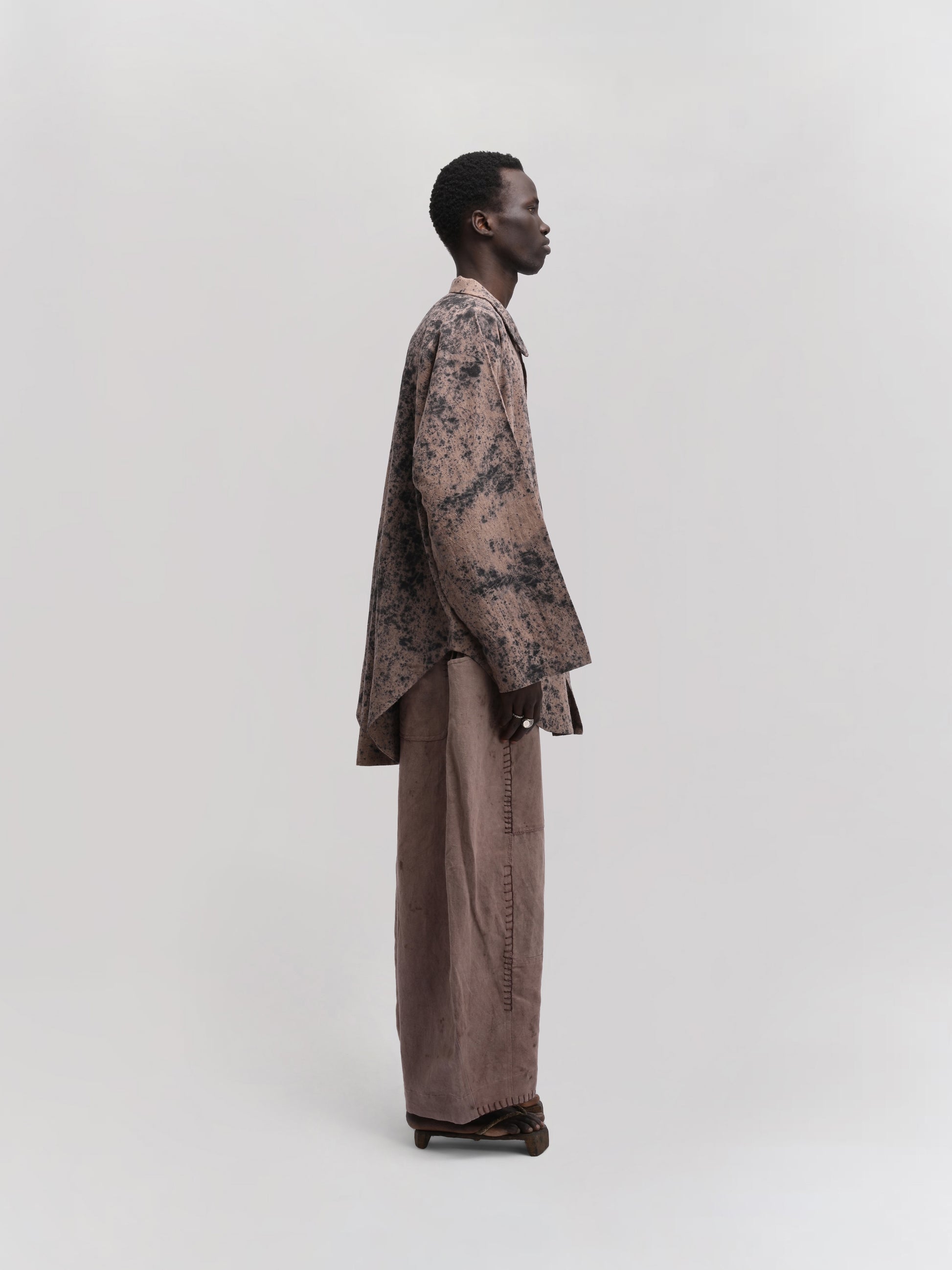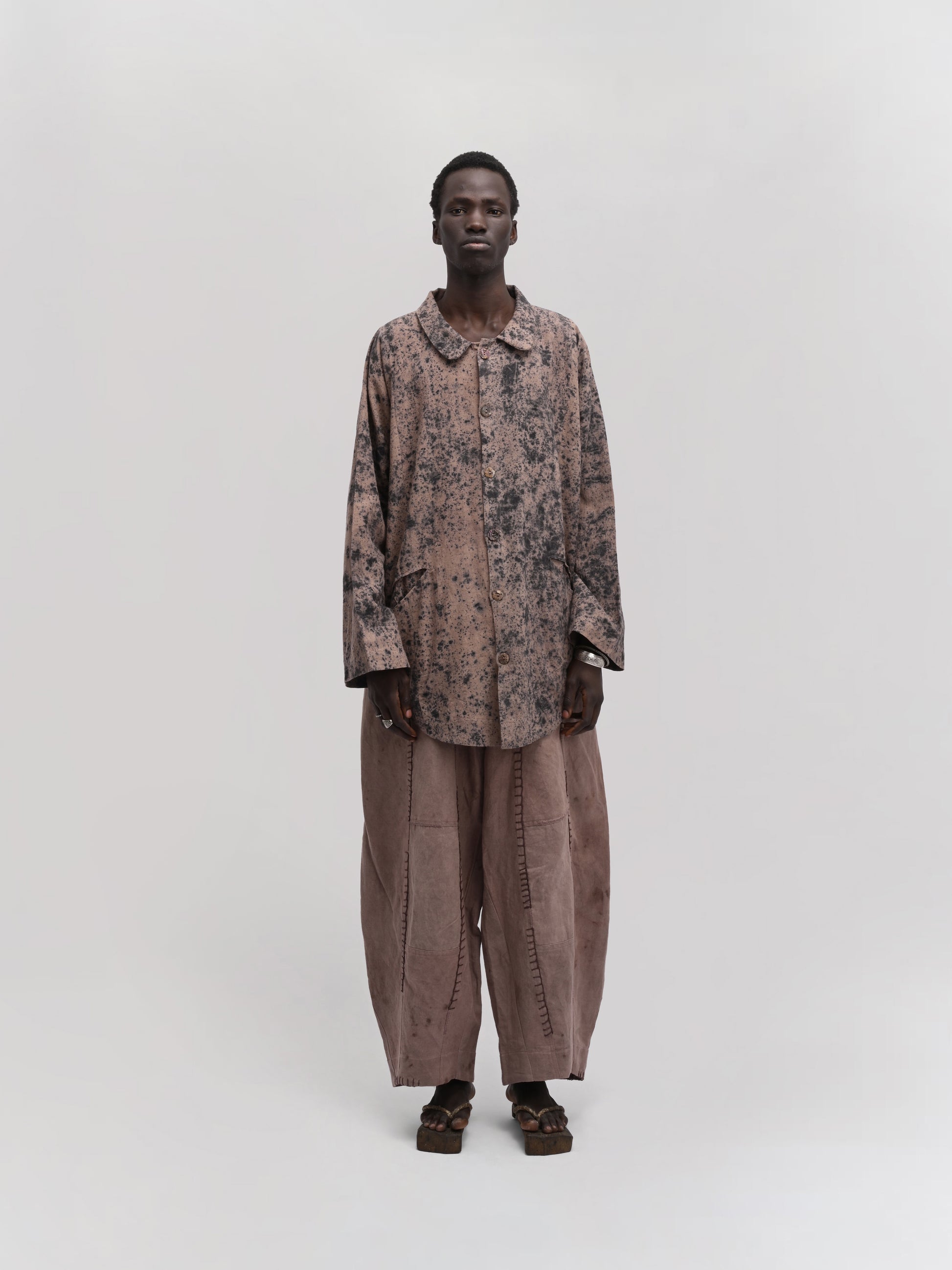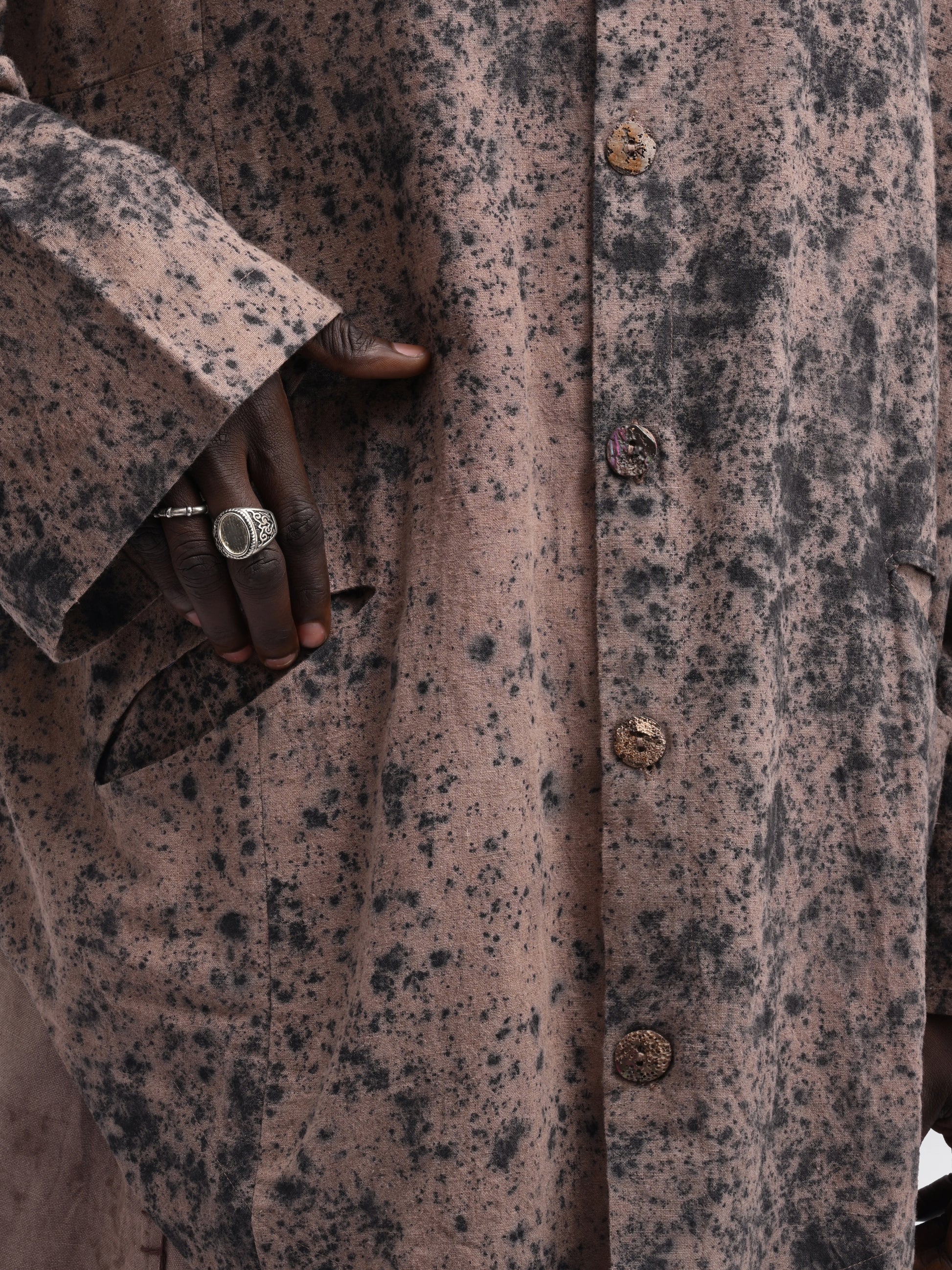 MATERIALS – Crafted from a linen–cotton blend, naturally rain-dyed in a harmonious mix of deep black and warm clay tones. Finished with lustrous natural shell buttons that add a subtle, organic elegance.