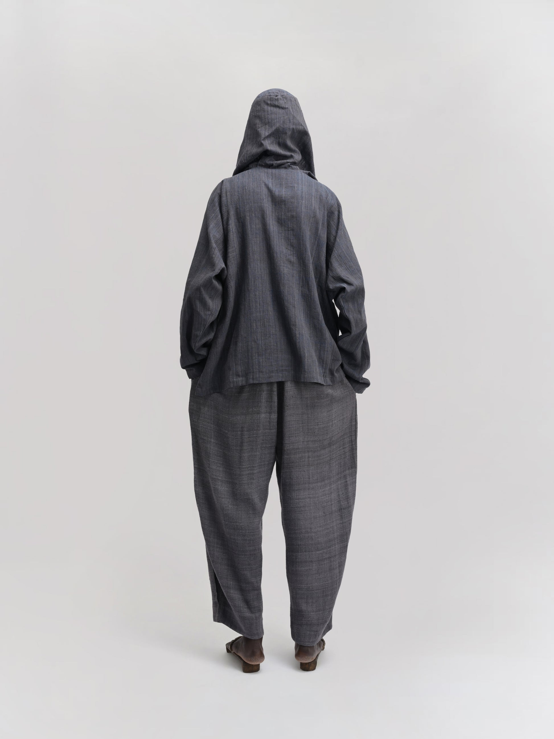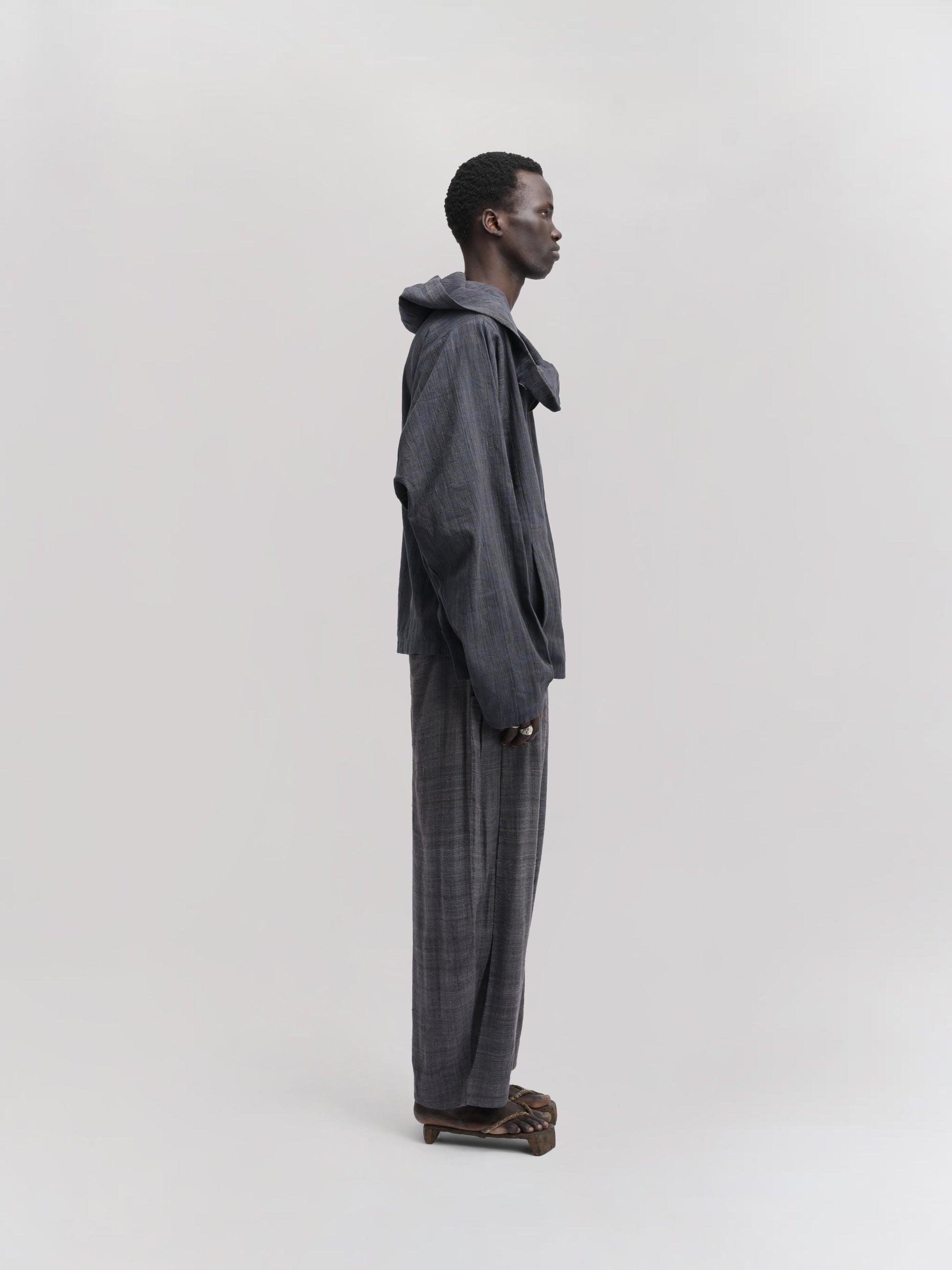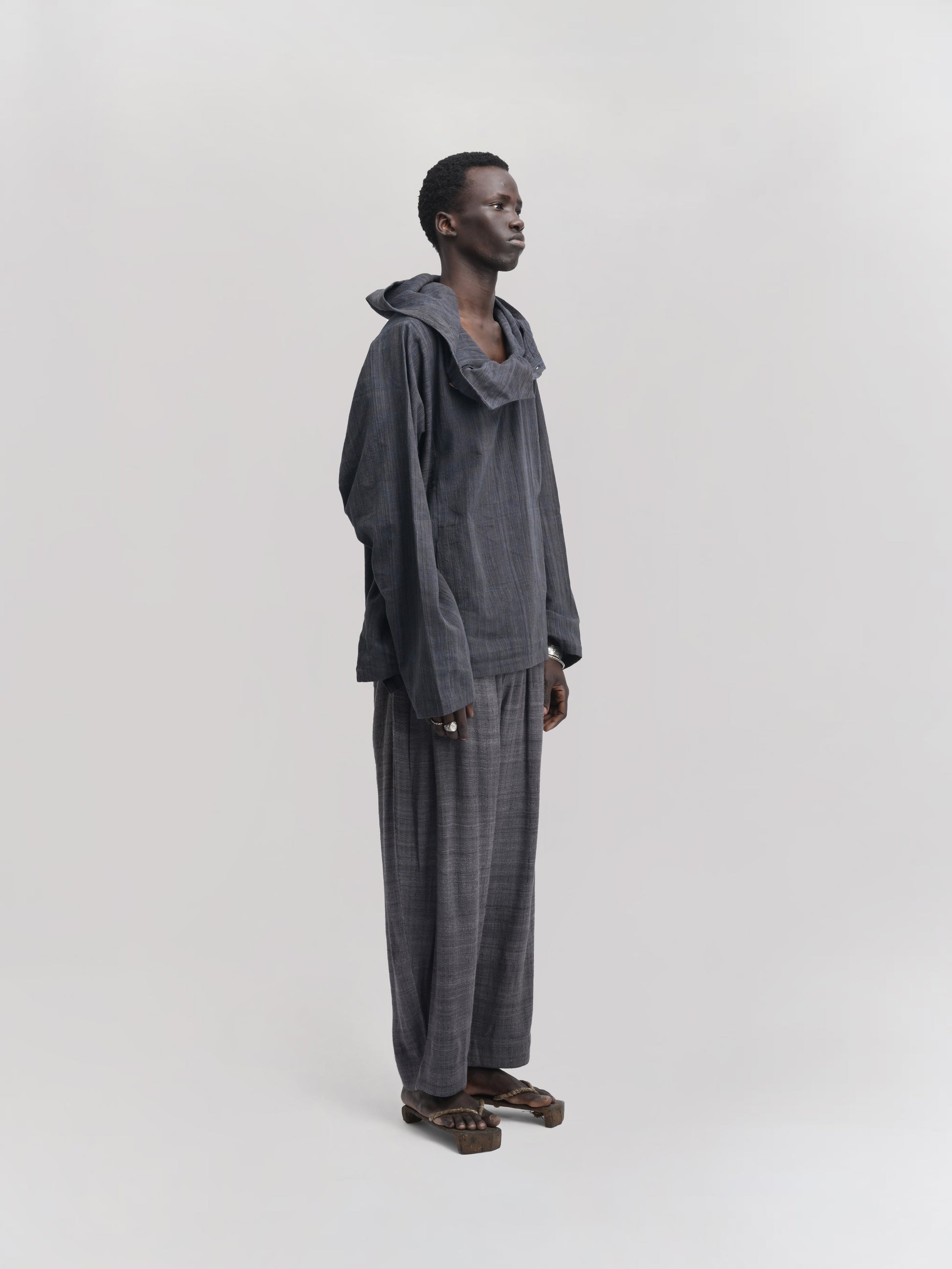 MATERIALS – Crafted from handwoven Kala cotton, yarn-dyed in deep black and blue tones. The fabric’s natural texture adds both durability and a distinctive artisanal character. Finished with smooth shell buttons, offering a subtle yet refined contrast.
