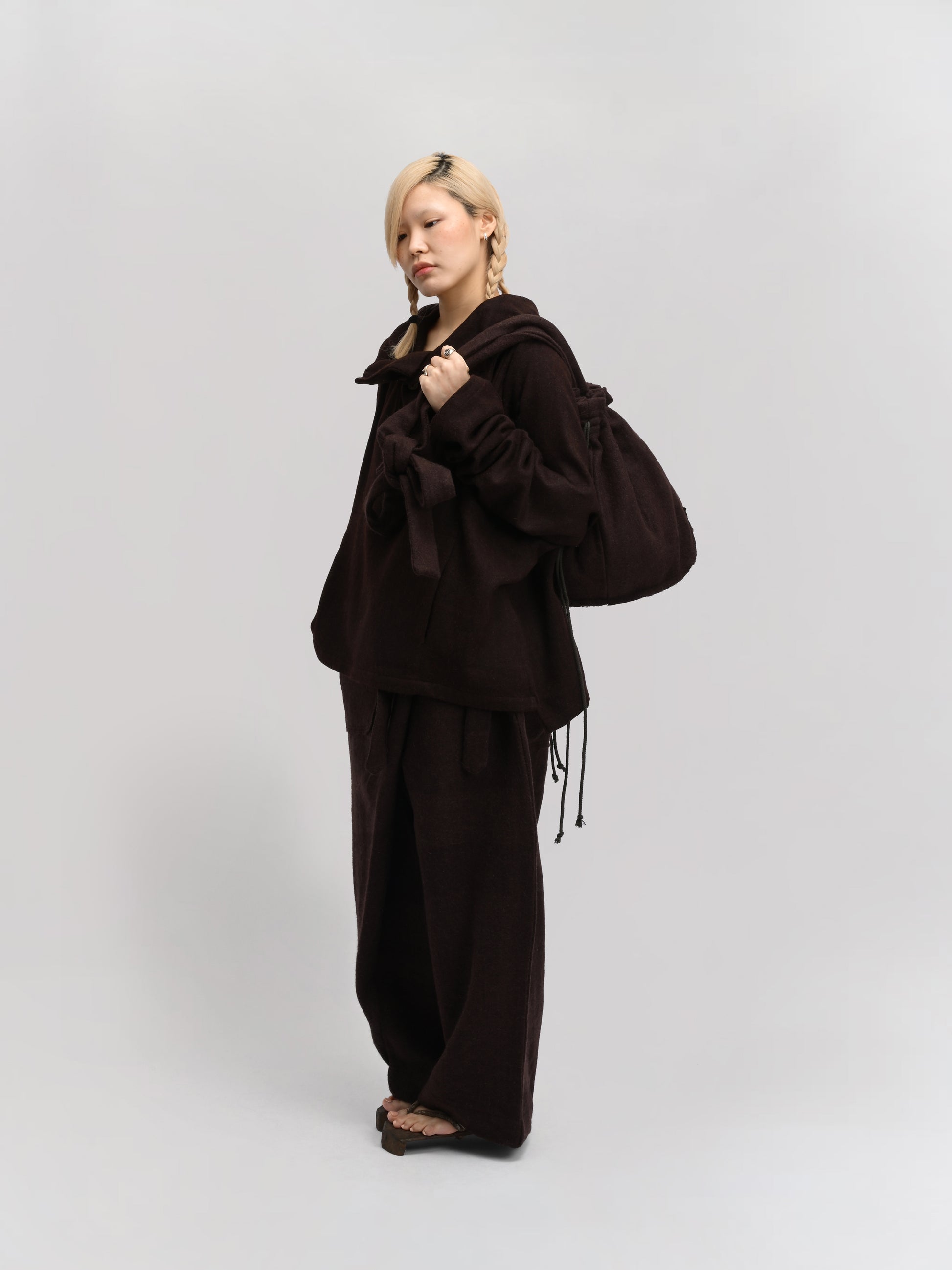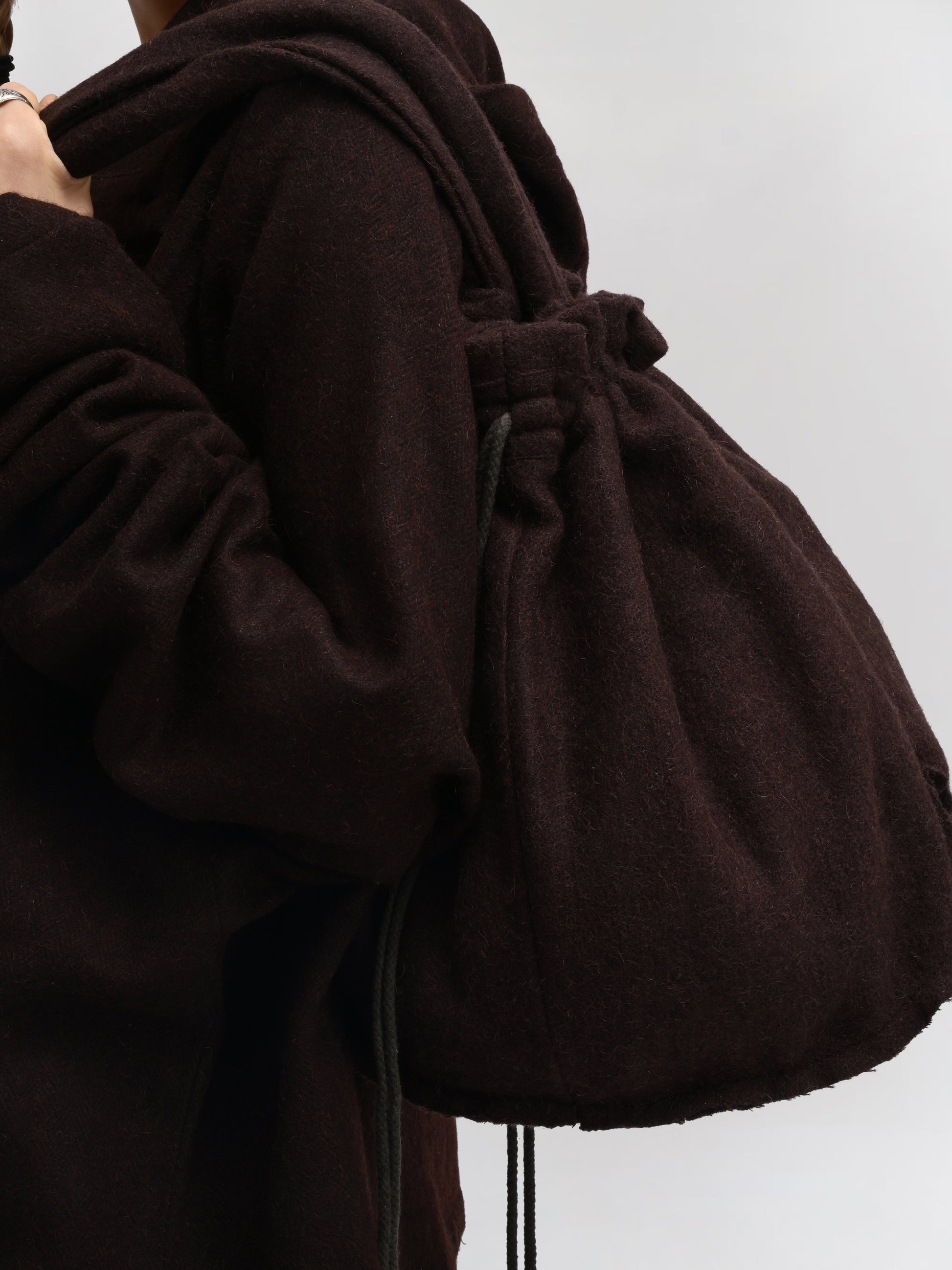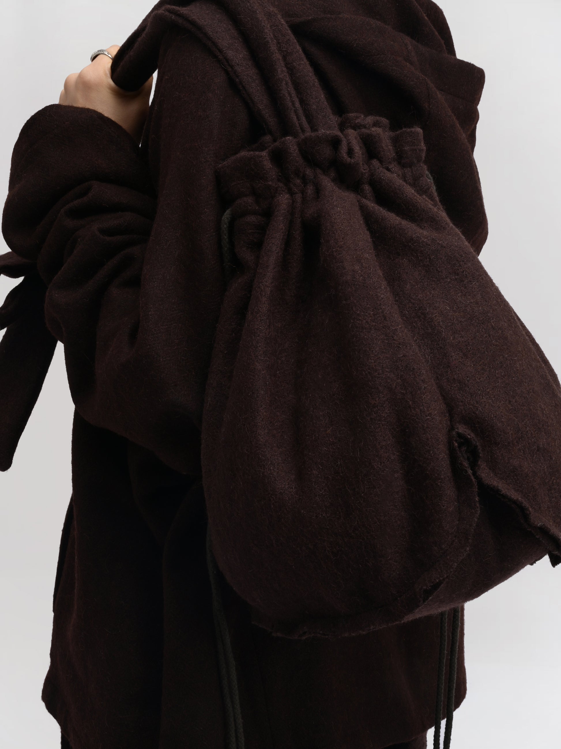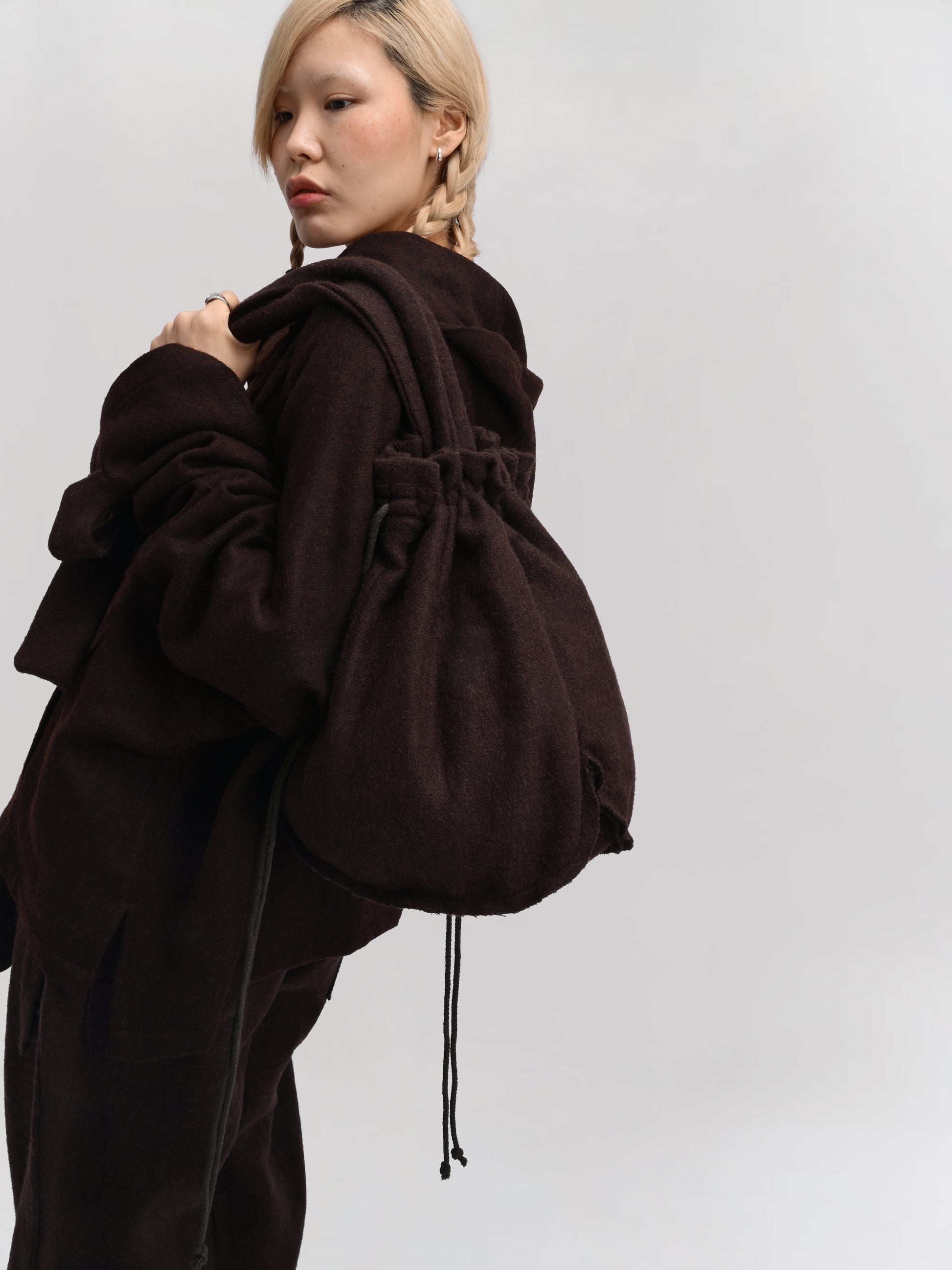 GARMENT – The Peardrop Bag is a unique, pear-shaped sack bag that blends artisanal craftsmanship with practical design. Its adjustable strap allows for versatile wear, while the structured yet supple silhouette makes it ideal for everyday use. The natural texture of the wool adds an earthy, sophisticated touch, perfect for carrying essentials in style.