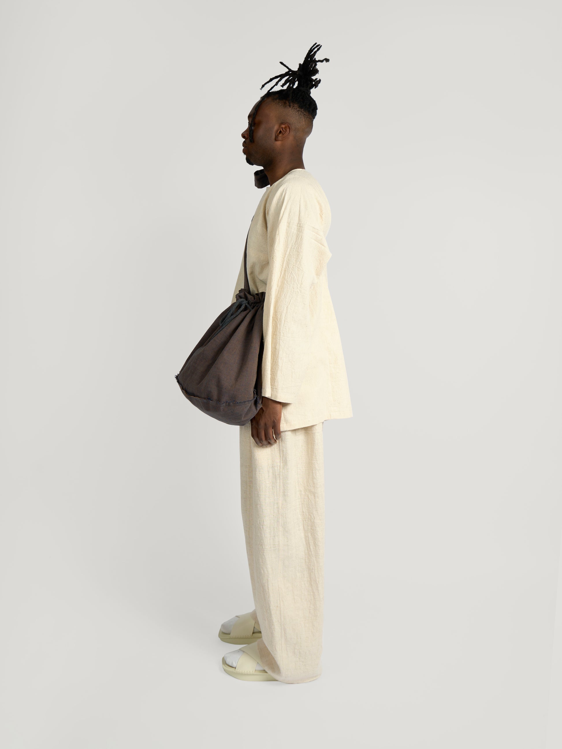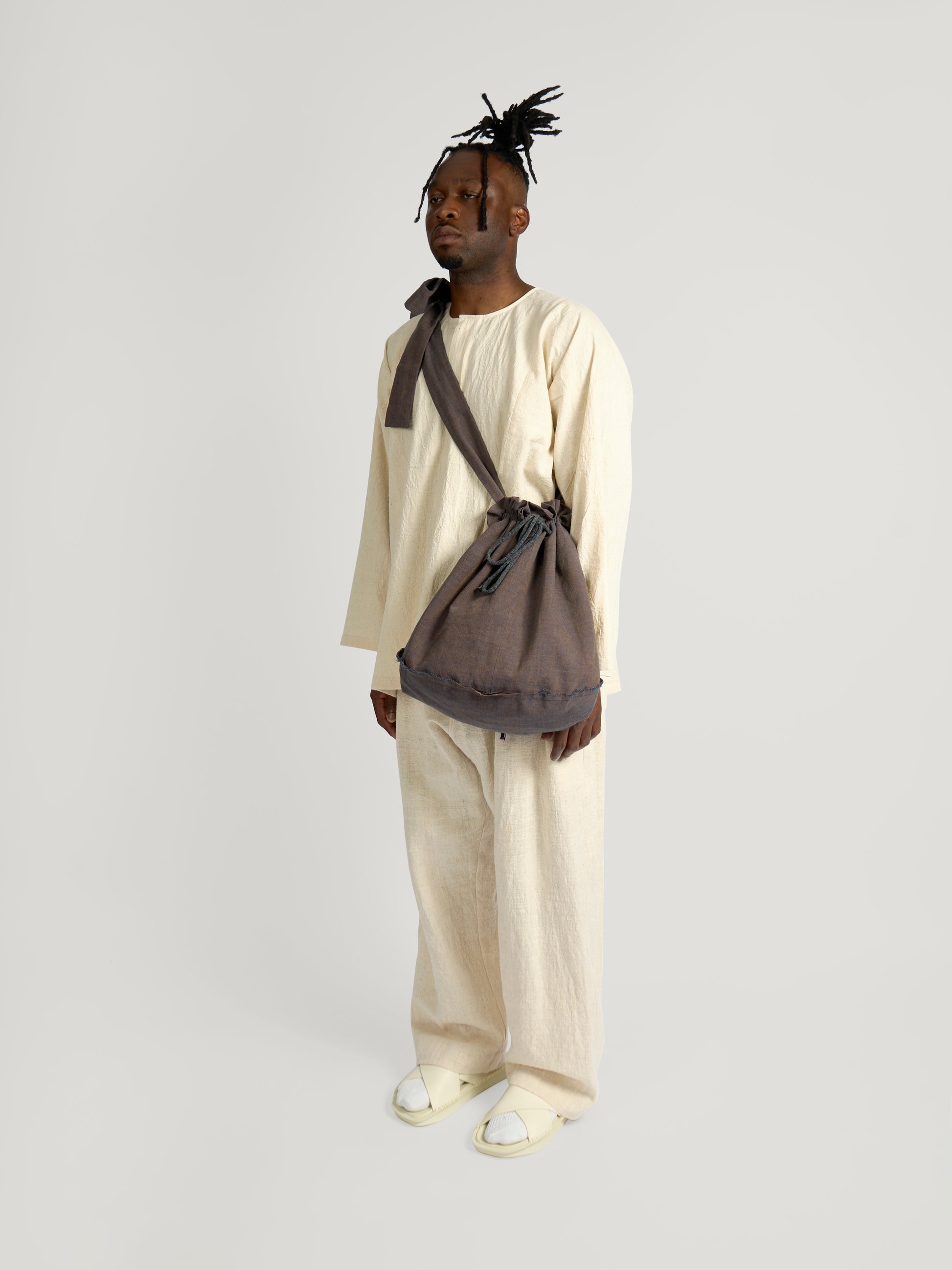 GARMENT – A pear-shaped sack bag with a soft yet structured form, designed for everyday versatility. Its curved silhouette sits comfortably against the body, while the cotton lining ensures durability. Finished with an adjustable strap, it can be worn crossbody or over the shoulder, making it both practical and refined.