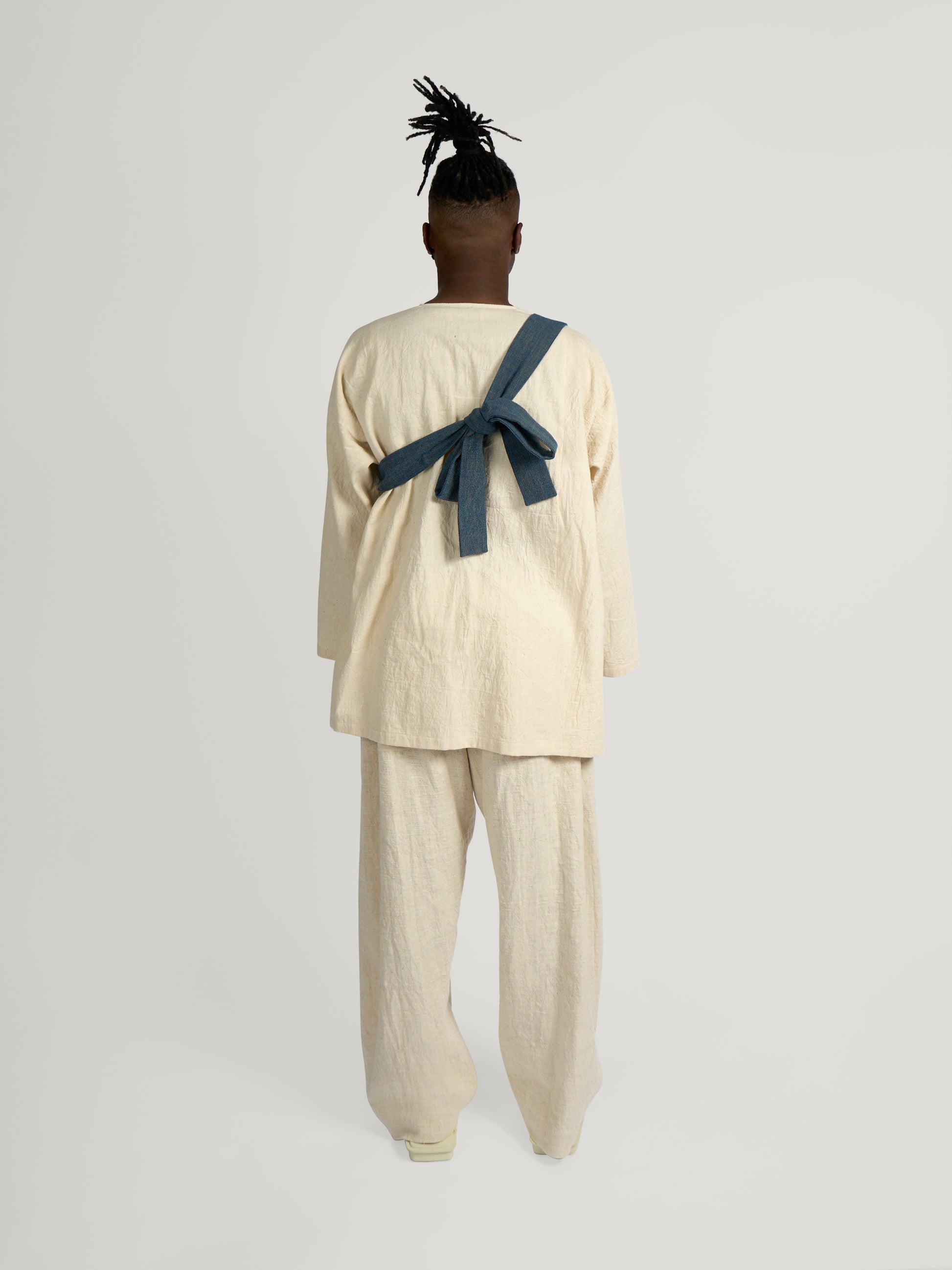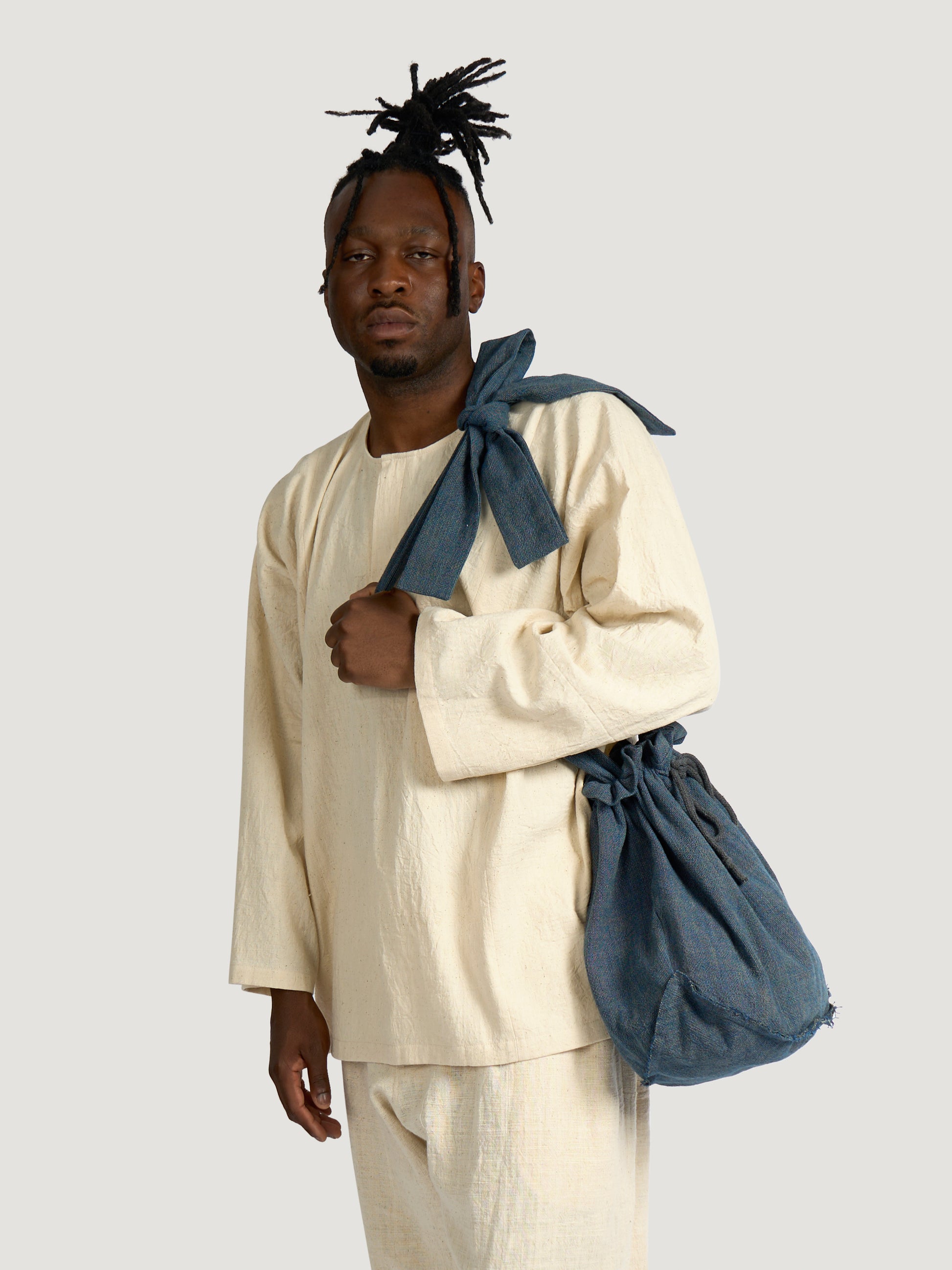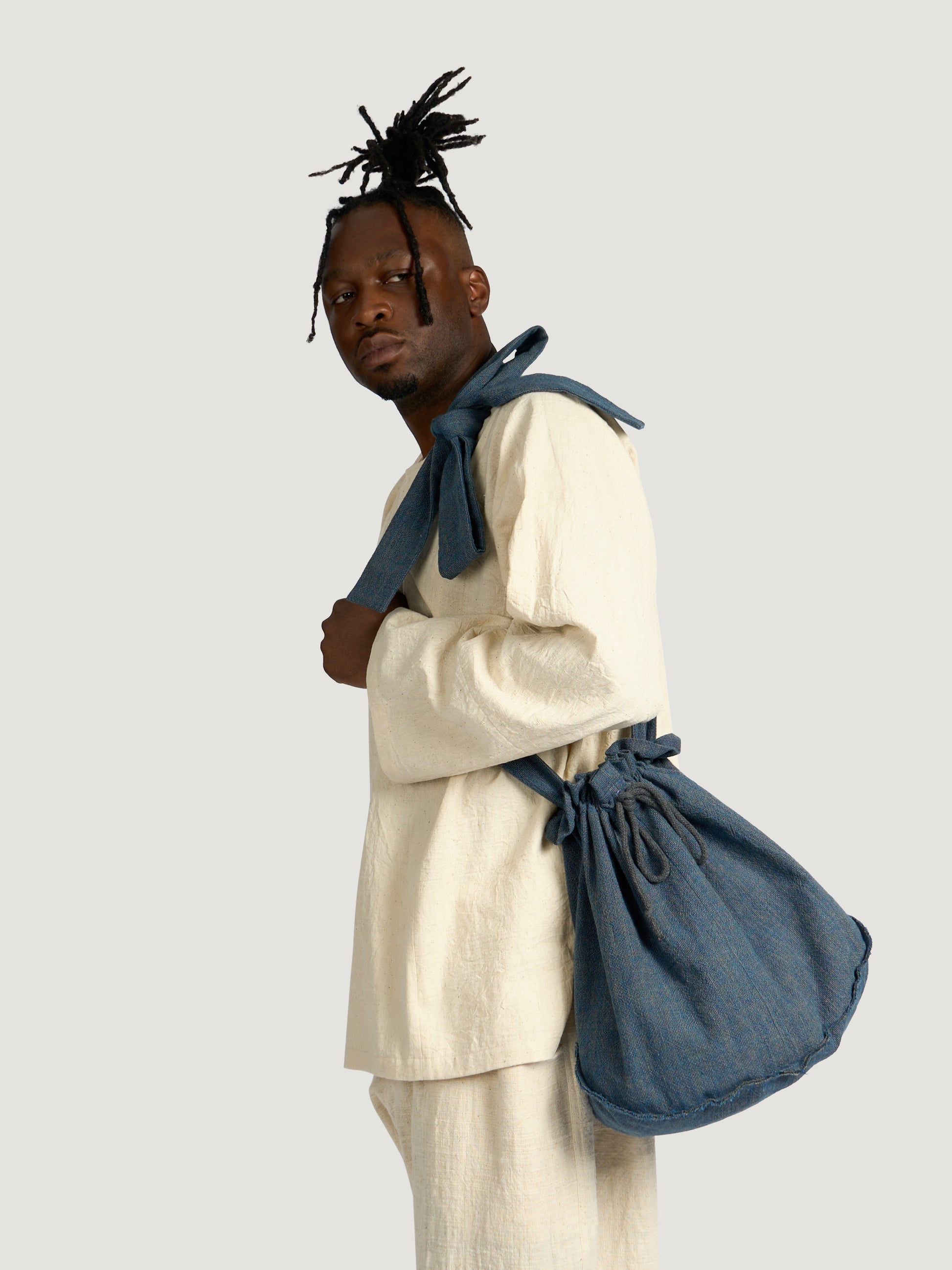 GARMENT – The Pear Drop Bag is crafted in a distinctive sack silhouette, echoing organic curves with a functional yet artful presence. Its marbled cotton surface blends indigo and pomegranate tones in a soft, shifting pattern unique to Japanese shimofuri weaving. Fully cotton-lined for durability, the bag is finished with an adjustable strap, offering both comfort and adaptability.